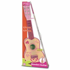 Une petite guitare classique en bois avec 6 cordes et aux couleurs girly pour débuter la musique avec un véritable instrument à partir de 3 ans.