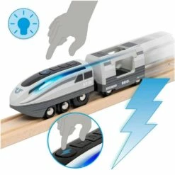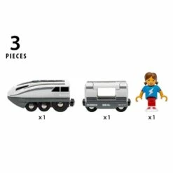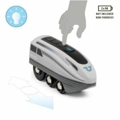 Passez Ă la vitesse supĂ©rieure avec la locomotive Ă piles Super Rapide. Il vous suffit d’appuyer sur le gros bouton turbo et ce train Ă piles va deux fois plus vite, ce qui fait de lui le train le plus rapide du BRIO World. La poussĂ©e turbo dure 5 secondes et, tandis que le train va Ă toute vitesse, les lumiĂšres blanches sur les cĂŽtĂ©s de la locomotive deviennent bleues. Cette locomotive Ă l’allure futuriste dispose d’un wagon qui accueille un passager chanceux de profiter du voyage.Â