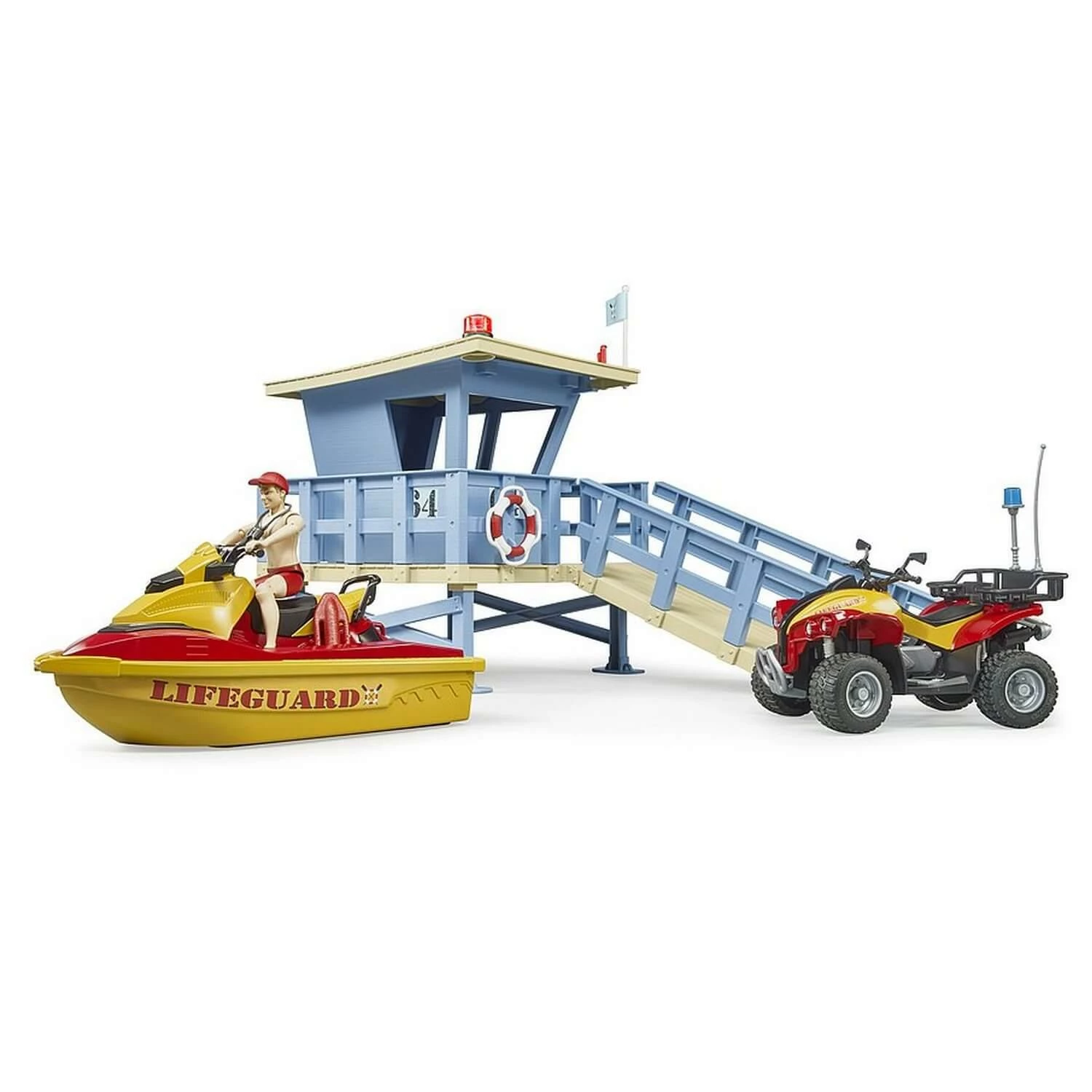 Le poste de secours est Ă©quipĂ© du nouveau gyrophare pour avertir de tout danger. Le nouveau quad est disponible Ă tout moment pour atteindre rapidement les lieux d’intervention sur la plage. Pour les interventions dans l’eau, le maĂźtre-nageur utilise le scooter des mers. Pour complĂ©ter le poste de secours, BRUDER propose Ă©galement la nouvelle maĂźtre-nageuse bworld avec le Paddle Stand up et le vĂ©hicule RAM Power en version sauveteur avec figurine et SUP.