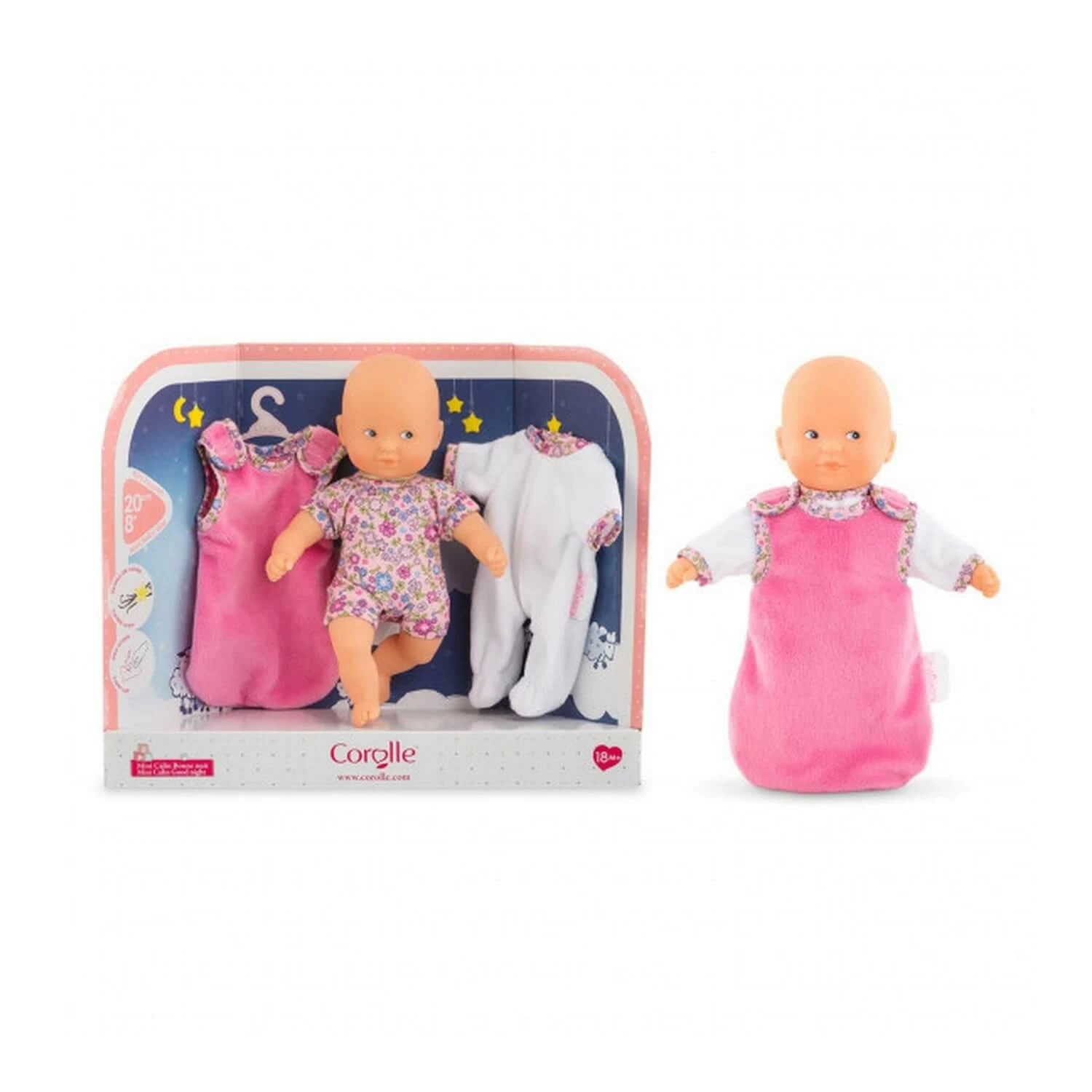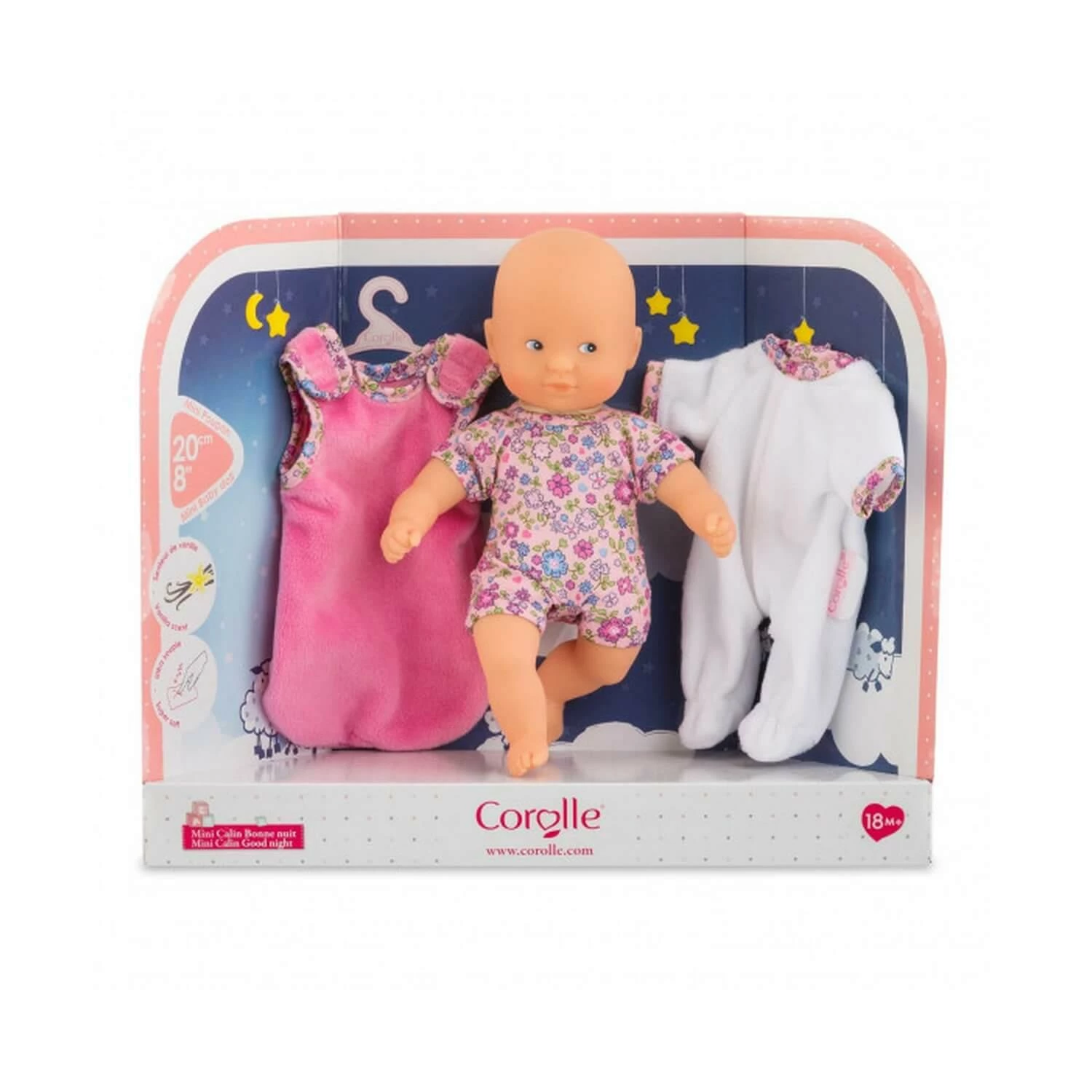 Mini calin bonne Nuit est un coffret composĂ© d’un poupon Mini Calin de 20 cm lĂ©ger et facile Ă emmener partout, d’un pyjama et d’une turbulette.