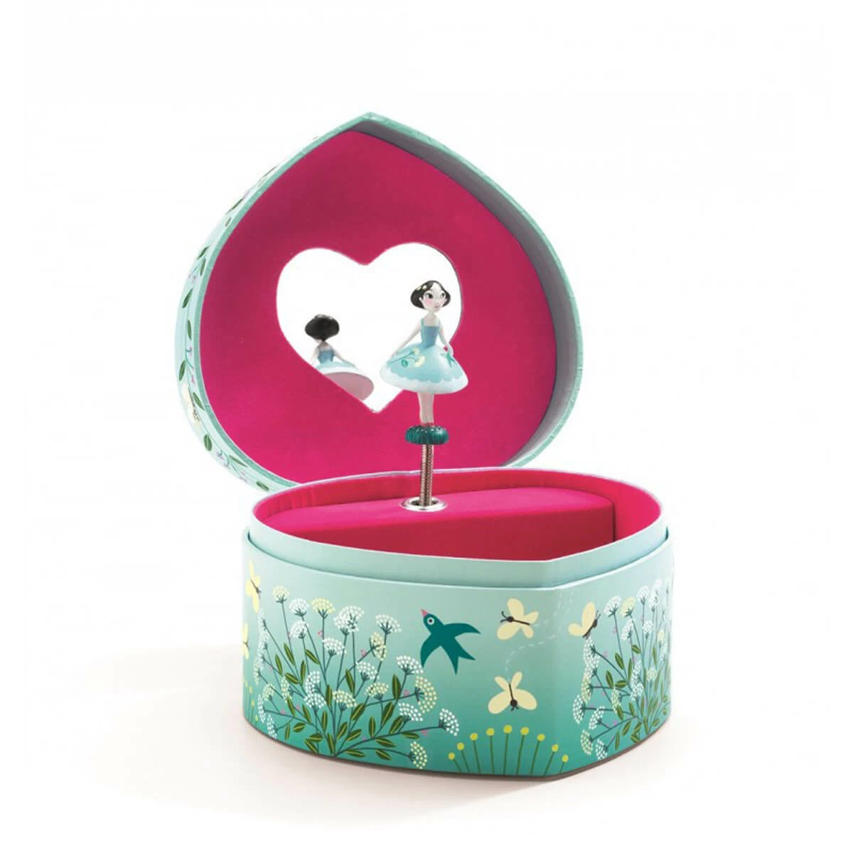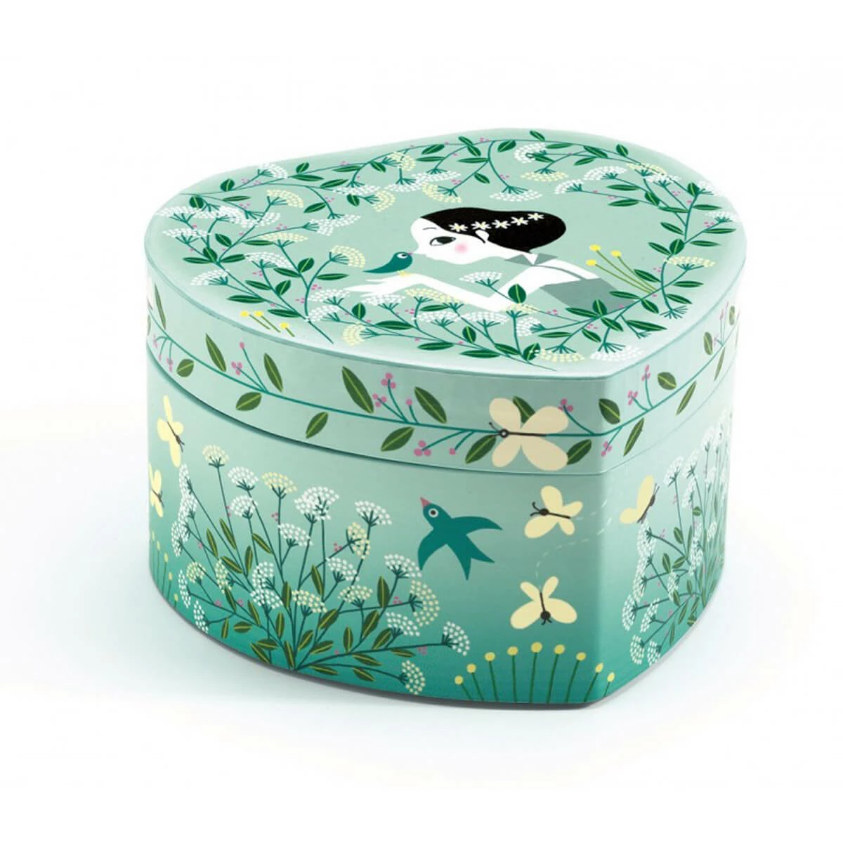 Ce superbe coffret en forme de coeur est décorée d’une belle illustration poétque représentant une jeune fille et son oiseau au milieu de fleurs sur fond vert. A l’intérieur, se dégage de la boîte encore plus de poésie. Tournez la manivelle, ouvrez la boîte et tout s’anime. Une danseuse tourne au son de la musique “Invitation à la valse” de Carl Maria von Weber.