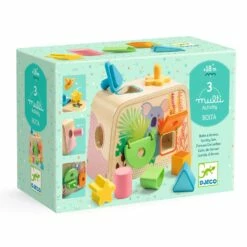 Multi Boita est une boîte à forme en bois qui permet à l’enfant de découvrir 3 manières différentes d’emboîter des formes géométriques dans les trous correspondants. Elle comporte 8 pièces de couleurs et de formes différentes à encastrer dans la boîte. L’enfant glisse les formes dans les trous correspondants, guidé par la forme de la pièce, mais également par sa couleur. Une fois terminé, il récupère les pièces en passant sa main à travers les gros élastiques situés au dos de la boîte.