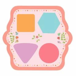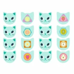 Contenu : 35 pièces : 4 sets de table, 2 tasses, 1 théière, 2 petites cuillères, 2 assiettes en bois, 8 biscuits illustrés, 8 pièces de feutrine, 8 cartes modèles “chat”.