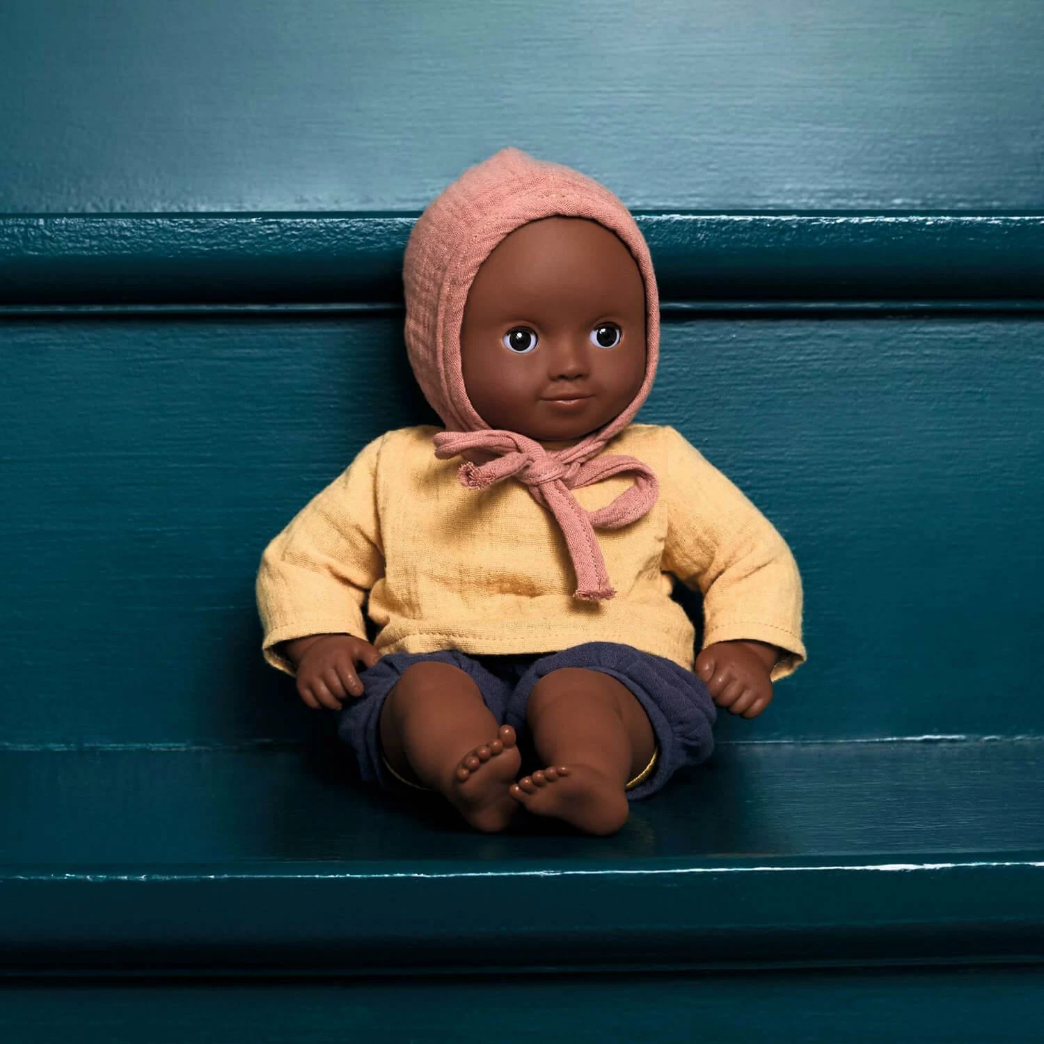 Avec ses beaux yeux noirs et sa tenue assortie, Baby Mimosa est une poupĂ©e pour les enfants dĂšs 18 mois. Elle est lĂ©gĂšre et sa taille (32 cm) est parfaitement adaptĂ©e aux petits bras. Son corps souple est imprimĂ© d’un joli “body”et permet de la positionner comme un vrai bĂ©bĂ©. Son visage, ses bras et ses jambes sont en vinyle trĂšs doux, agrĂ©able au toucher. Avec ses yeux dormeurs, elle s’endort quand on la couche sur le dos. Ce poupon est habillĂ© d’un bloomer, d’une chemise et d’un bĂ©guin en double Gaze 100 % coton. Contenu : 1 poupĂ©e de 32 cm (corps en tissu et tĂȘte, bras et jambes en vinyle), 1 bloomer, 1 chemise manches longue et 1 bĂ©guin.