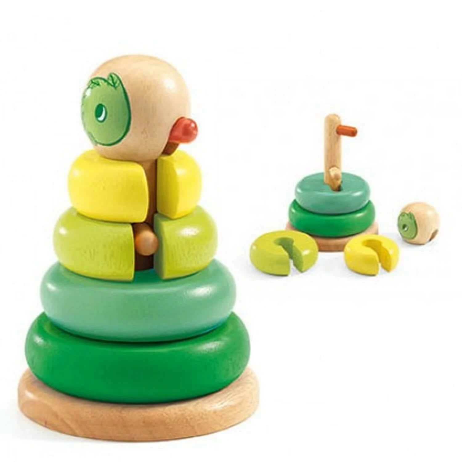 Ce jeu adaptĂ© pour les tout-petits dispose de 4 anneaux dans les tons verts Ă enfiler sur un socle et un tige avec un tĂȘte de canard.