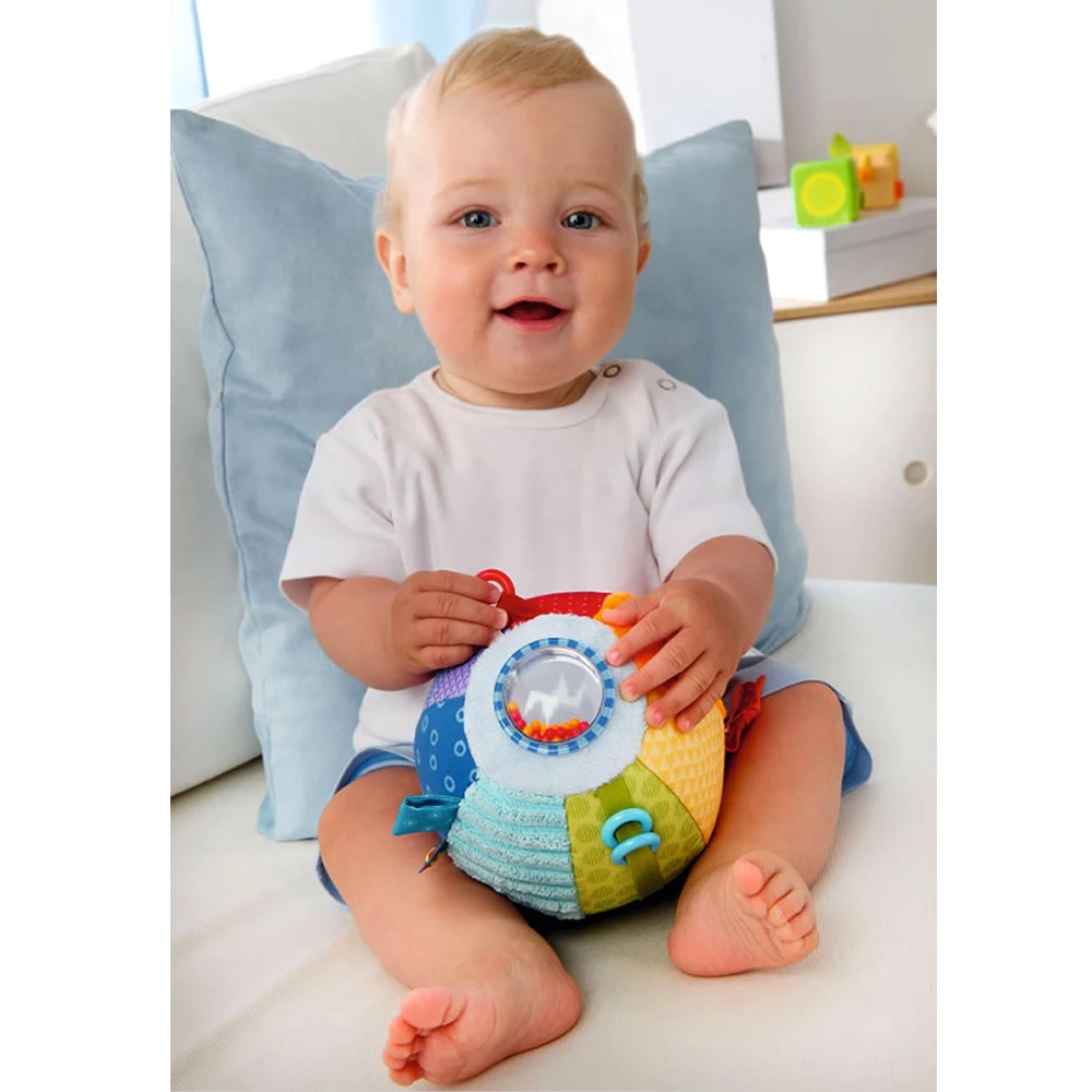La balle dĂ©couverte De toutes les couleurs est conçue pour Ă©veiller les sens des enfants Ă partir de 6 mois. Dans un premier temps, ces derniers sont incitĂ©s Ă ramper afin de l’attraper. Puis, une fois l’objet entre leurs mains, ils pourront explorer et manipuler tous les Ă©lĂ©ments qui la composent : un noeud, un filet, trois anneaux, un petit miroir, une capsule remplie de billes colorĂ©es, etc.