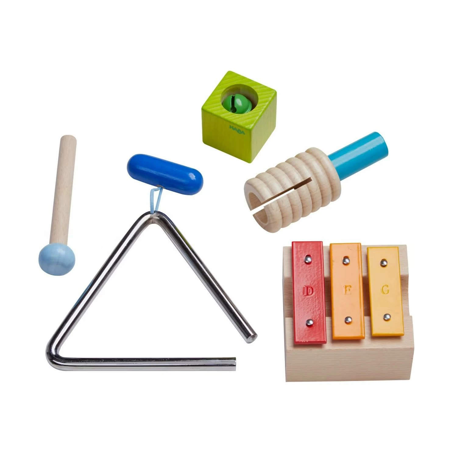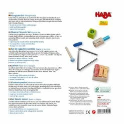 Contenu: 1 triangle, 1 cube sonore (avec une clochette), 1 mini-mĂ©tallophone, 1 reco-reco (gĂŒiro), 1 baguette.