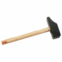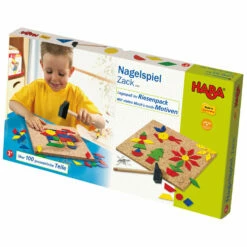 Plaque de liège, marteau en bois, clous et modèles en couleur.