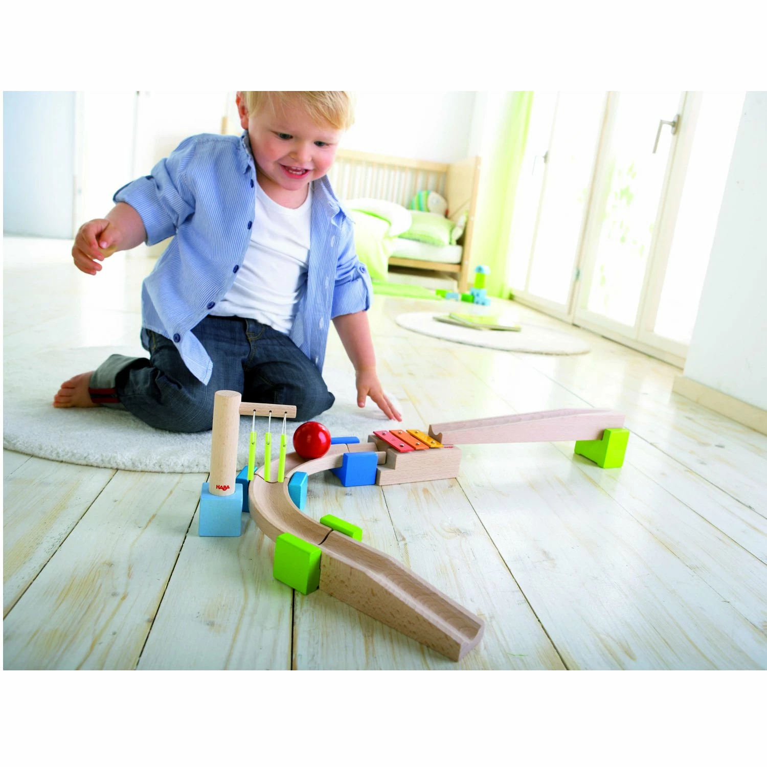 Les amateurs en herbe du Premier toboggan à billes vont être ravis car celui-ci va être encore plus captivant : quand la bille à effets roule sur le métallophone ou passe en dessous du carillon, elle fait retentir de jolis sons.