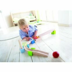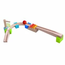 Contenu : 2 rampes, 2 virages, 4 blocs-raccords en couleur, 1 bloc métallophone avec glissière de raccord, 1 bloc carillon, 1 bille à effets avec grelot.