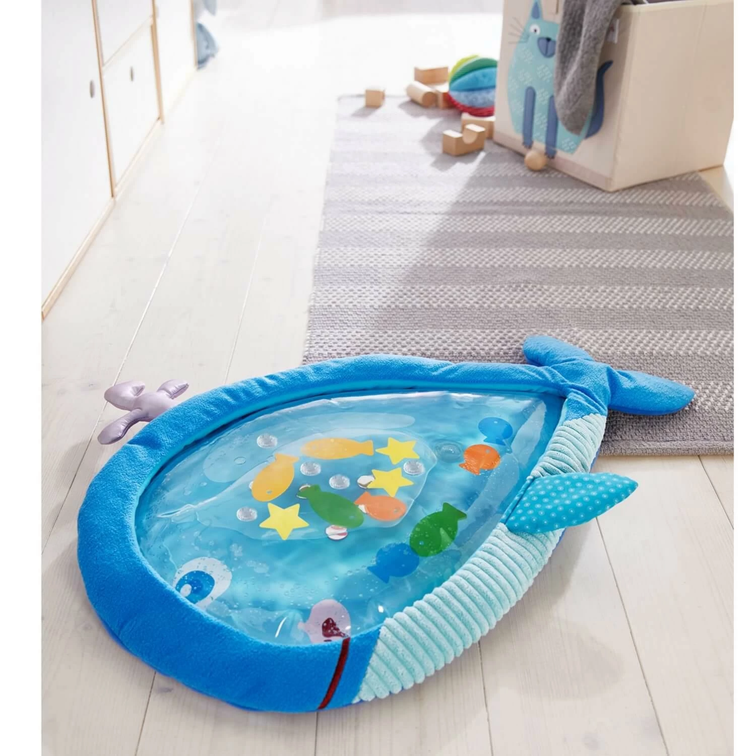 DĂ©couvrez le tapis d’Ă©veil aquatique Ă la forme de baleine de la marque Haba.