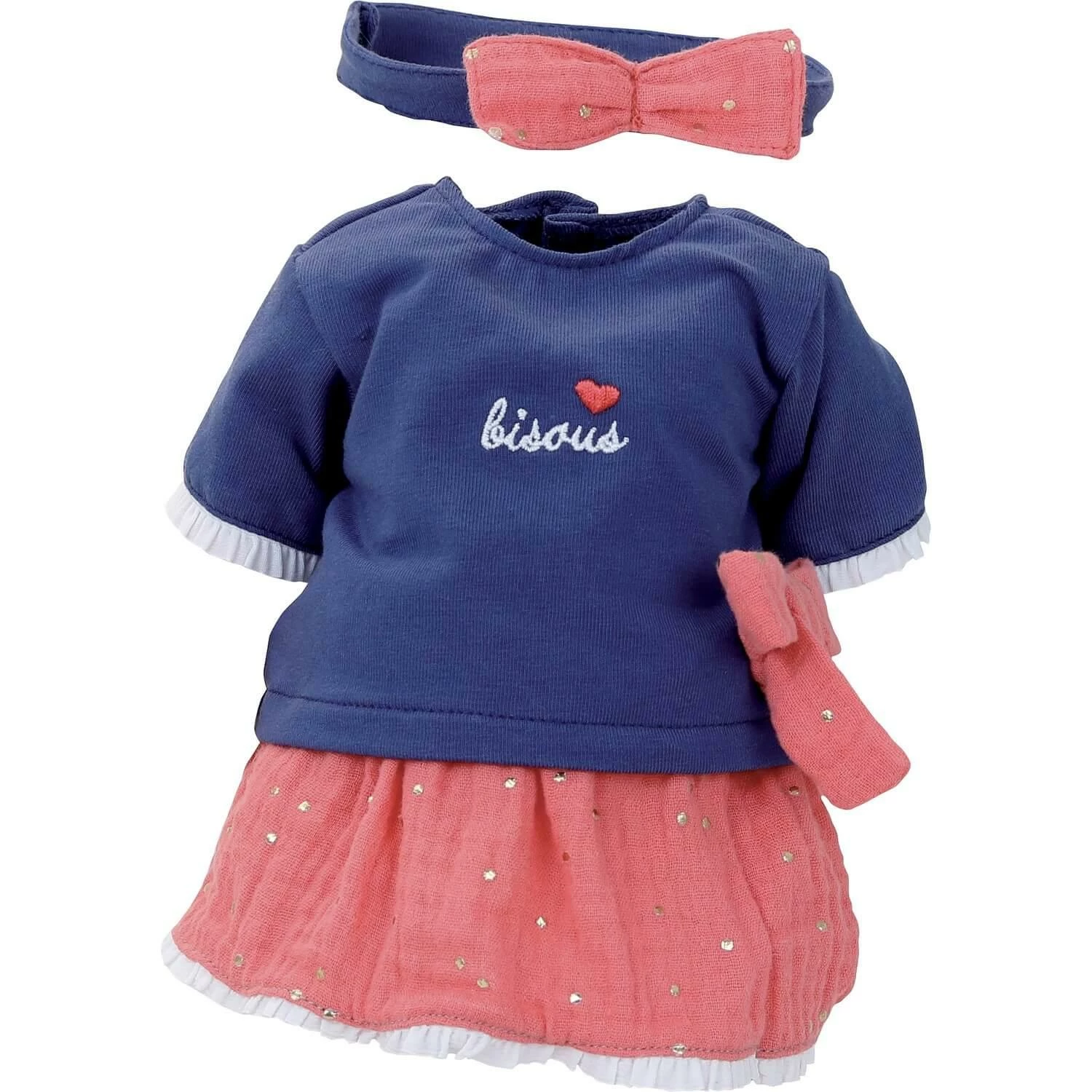 Cette jolie tenue au style romantique est composée d’une jupe corail à points dorés et d’une blouse bleu marine brodée et agrémentée d’un nœud assorti à la jupe. Un biais plissé blanc fait ressortir les couleurs.