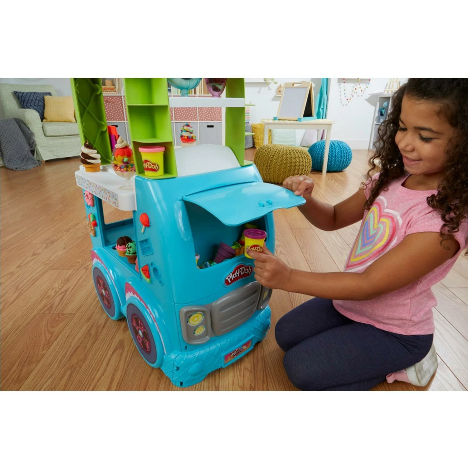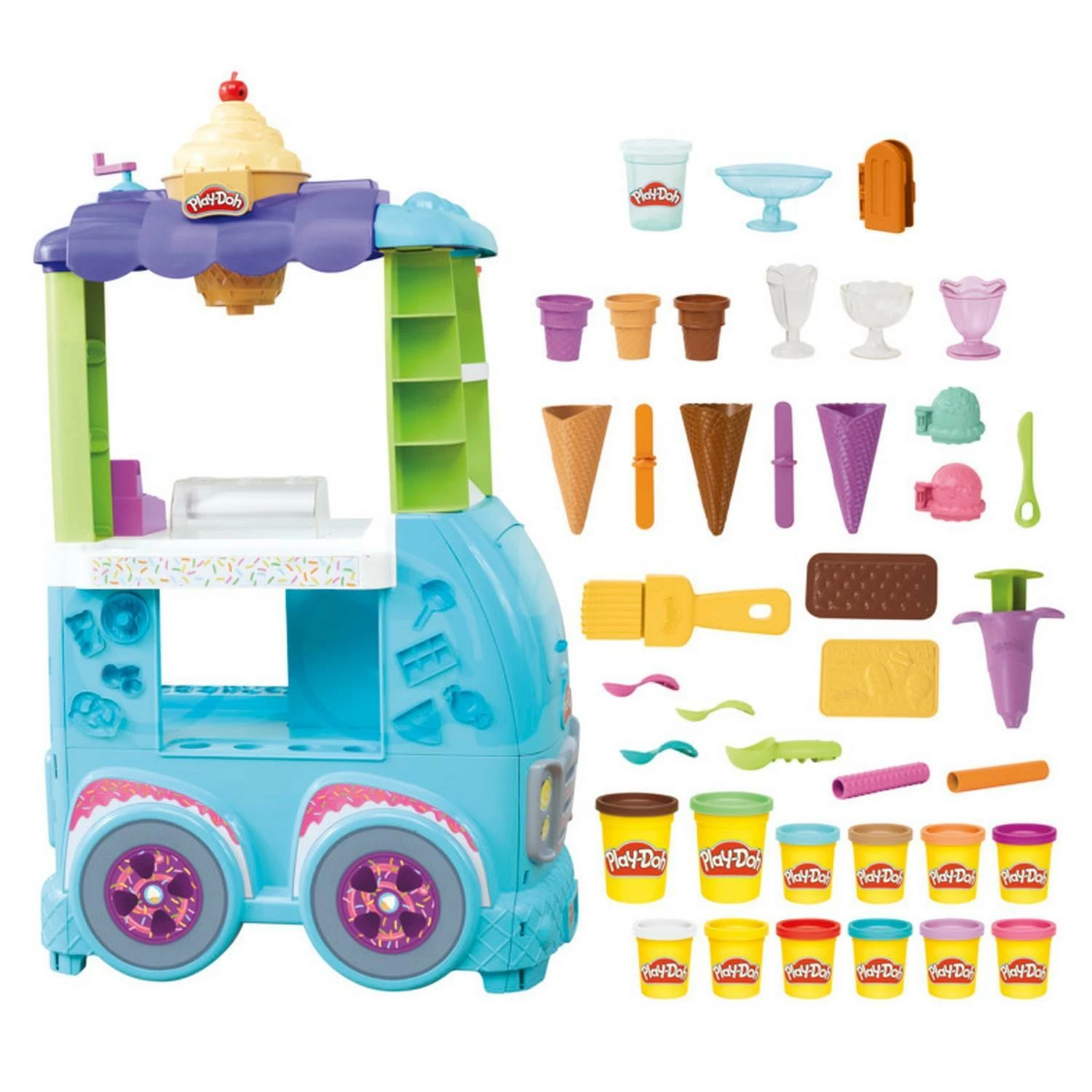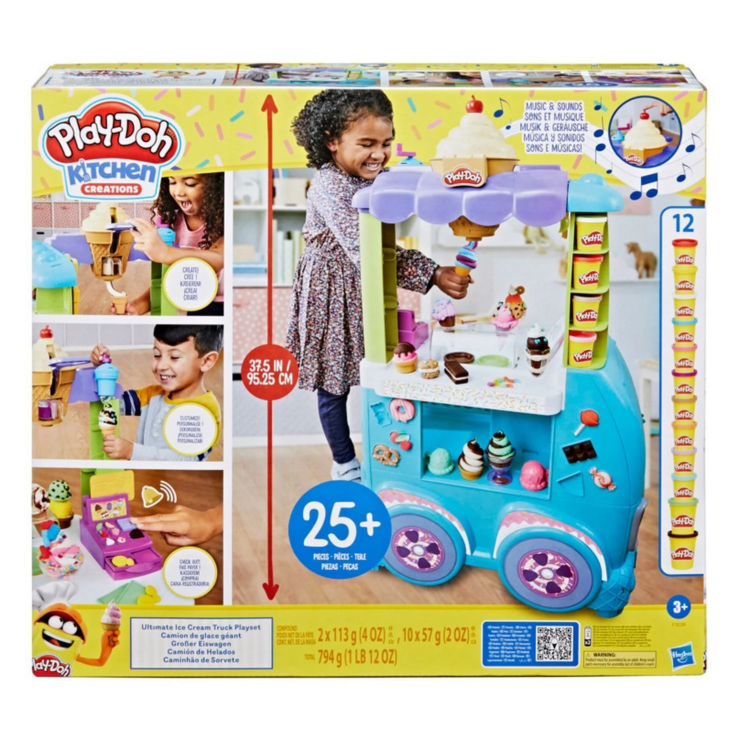 Ce coffret inclut le camion de glace géant (95.25cm), 27 accessoires pour imaginer des magnifiques créations et 12 pots de pâte à modeler de différentes couleurs. Ce camion de glace a aussi été conçu pour faciliter la vie des parents ; il a plusieurs modules de rangement et il se nettoie facilement une fois le jeu terminé !