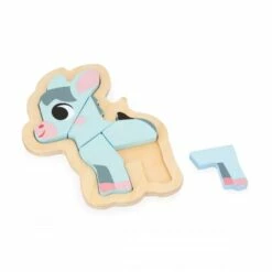 On retrouve les animaux favoris des tout-petits : une poule de 2 pièces, une vache de 3 pièces, une chèvre de 4 pièces et un âne de 5 pièces. Les pièces à replacer dans le bon ordre sur un support en bois sont suffisamment grosses pour que bébé puisse bien les prendre en main.