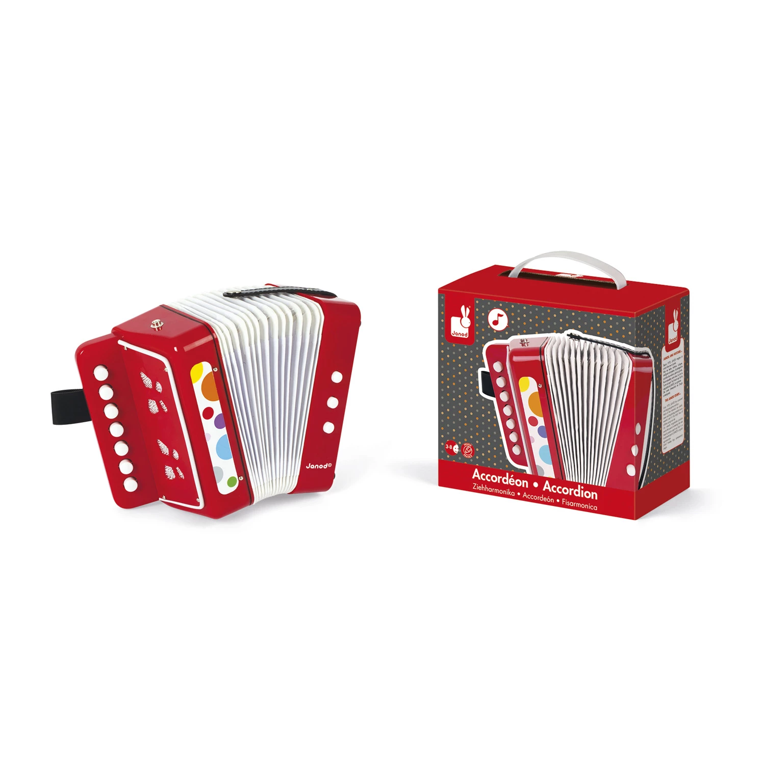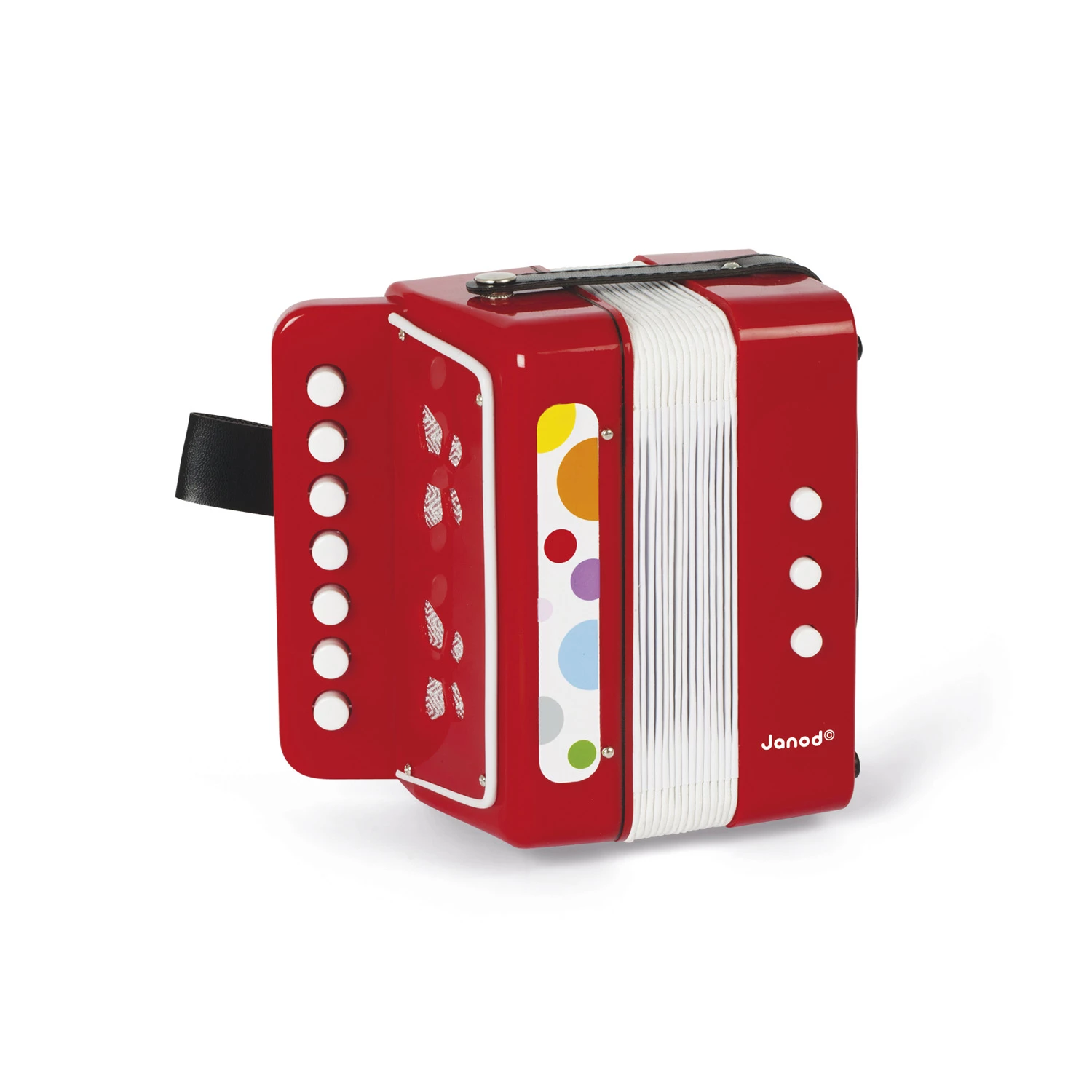 AccordĂ©on pour enfant Ă soufflet avec sangle de maintien en plastique. Confetti, c’est une gamme complĂšte d’instruments de musique avec des motifs Pop N’ Rock !