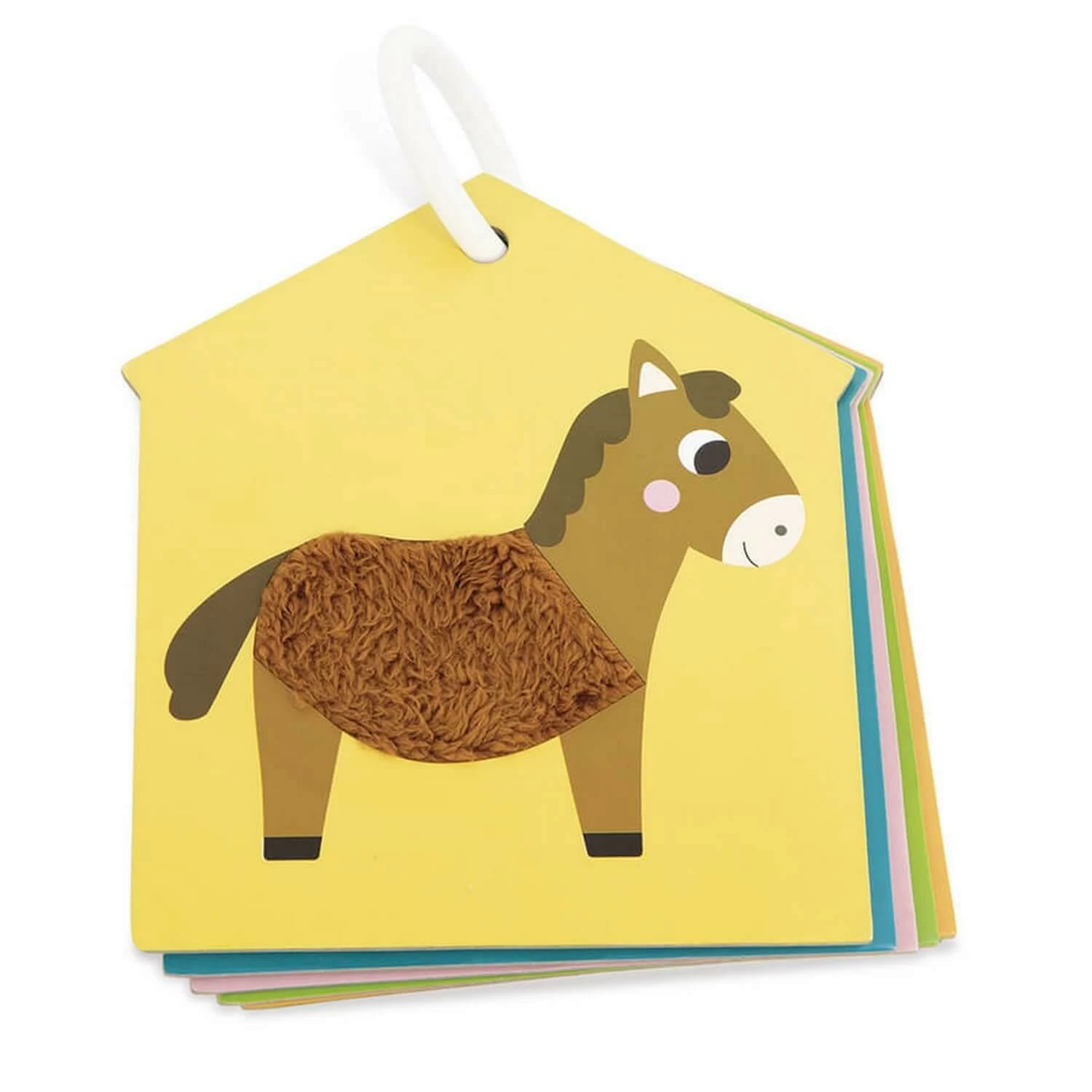 Ce set contient 6 cartes animaux avec des matières Ă toucher liĂ©es par un anneau amovible pour maintenir les cartes et les transporter partout facilement. Une carte ‘ferme’ avec ouverture sur le devant permet Ă©galement de jouer Ă cache-cache avec les cartes.Â