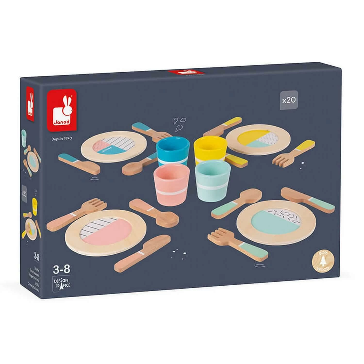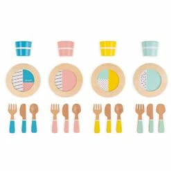 Alors, on sort le grand jeu avec cette jolie dinette en bois, idĂ©ale pour les enfants de 3 Ă 8 ans. Ce set de dinette est complet pour 4 personnes, soit 20 piĂšces en tout . Pour le style, rien n’est laissĂ© au hasard, on retrouve du bois naturel, associĂ© Ă des motifs graphiques, mis en valeur par de belles couleurs pop ! De quoi se rĂ©galer avec classe ! Il ne restera plus qu’Ă ajouter des fruits et lĂ©gumes Ă ce beau jouet de cuisine en bois pour avoir un tableau parfait.Â