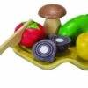 Dans les petits casiers les enfants pourront placer les fruits et lĂ©gumes suivants : trois pommes, trois bananes, trois fraises, trois carottes, trois radis et trois pommes de terre. Sur le devant de chaque casier une petite partie ardoise permettra Ă©galement d’inscrire le prix de chaque article.