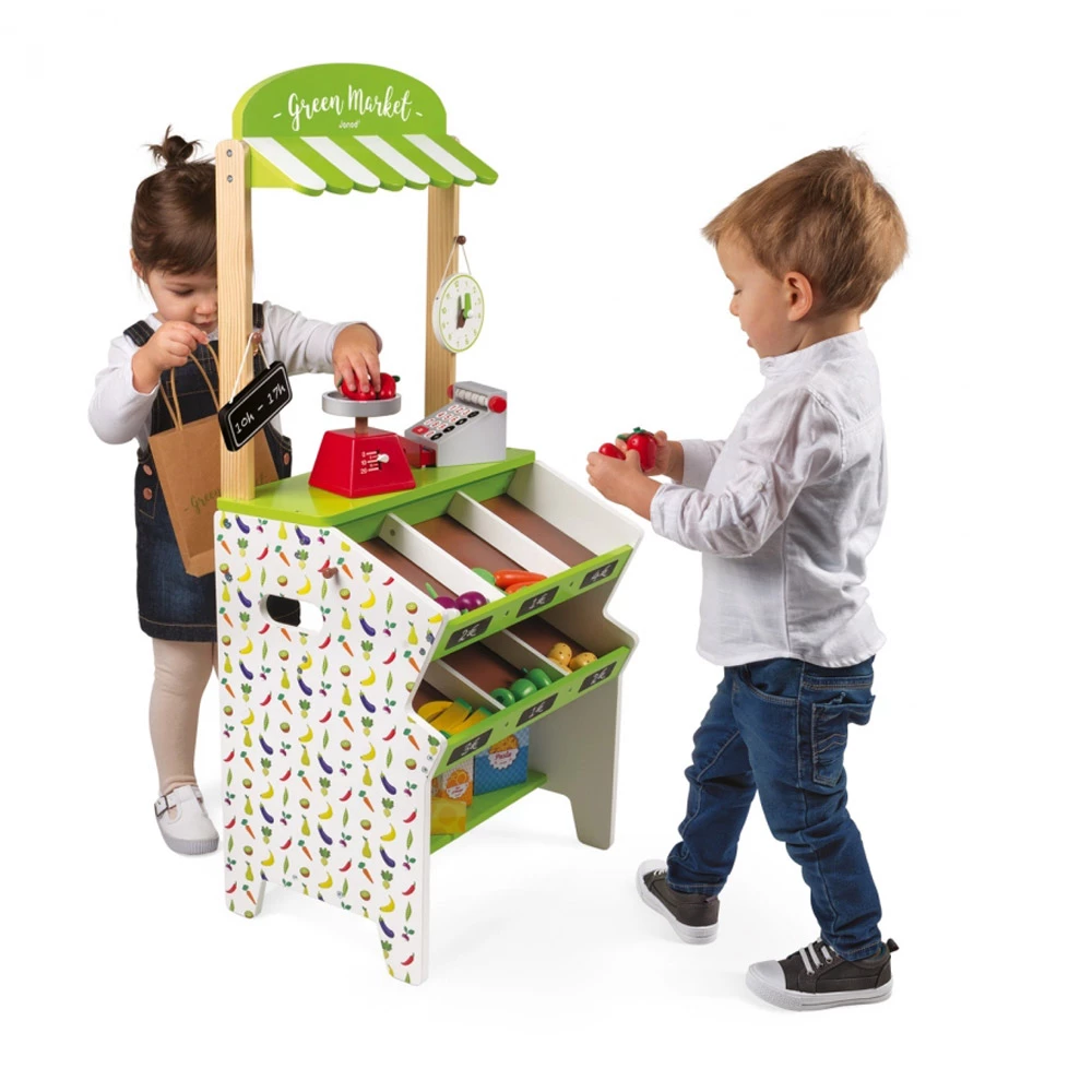 Avec ses nombreux accessoires, elle est parfaite pour les apprentis marchands ! La marchande Green Market est Ă©quipĂ©e d’une horloge, d’un panneau ardoise pour poser les additions ou noter les horaires d’ouverture, d’une boite de craies, de six boites d’aliments en carton, d’une caisse enregistreuse et d’une balance.