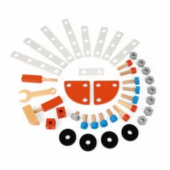 Il comporte de nombreux accessoires pour inventer des objets à monter et à démonter à l’infini, au gré de l’imagination de votre enfant : 3 outils magnétiques et 40 accessoires (boulons, écrous, vis, rondelles, plaquettes …), un étau, une horloge pour apprendre l’heure, un tableau pour écrire à la craie et une fiche pour reconstituer une voiture de course.