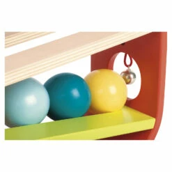 Approchez la balle du trou avec le marteau puis regardez la tomber et rouler. La prochaine dans la file arrive aussitĂŽt. A la sortie, les balles font retentir la clochette en bois.