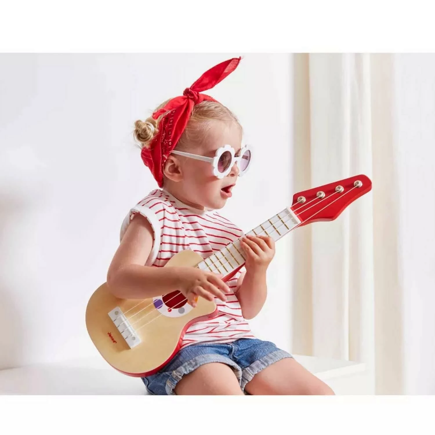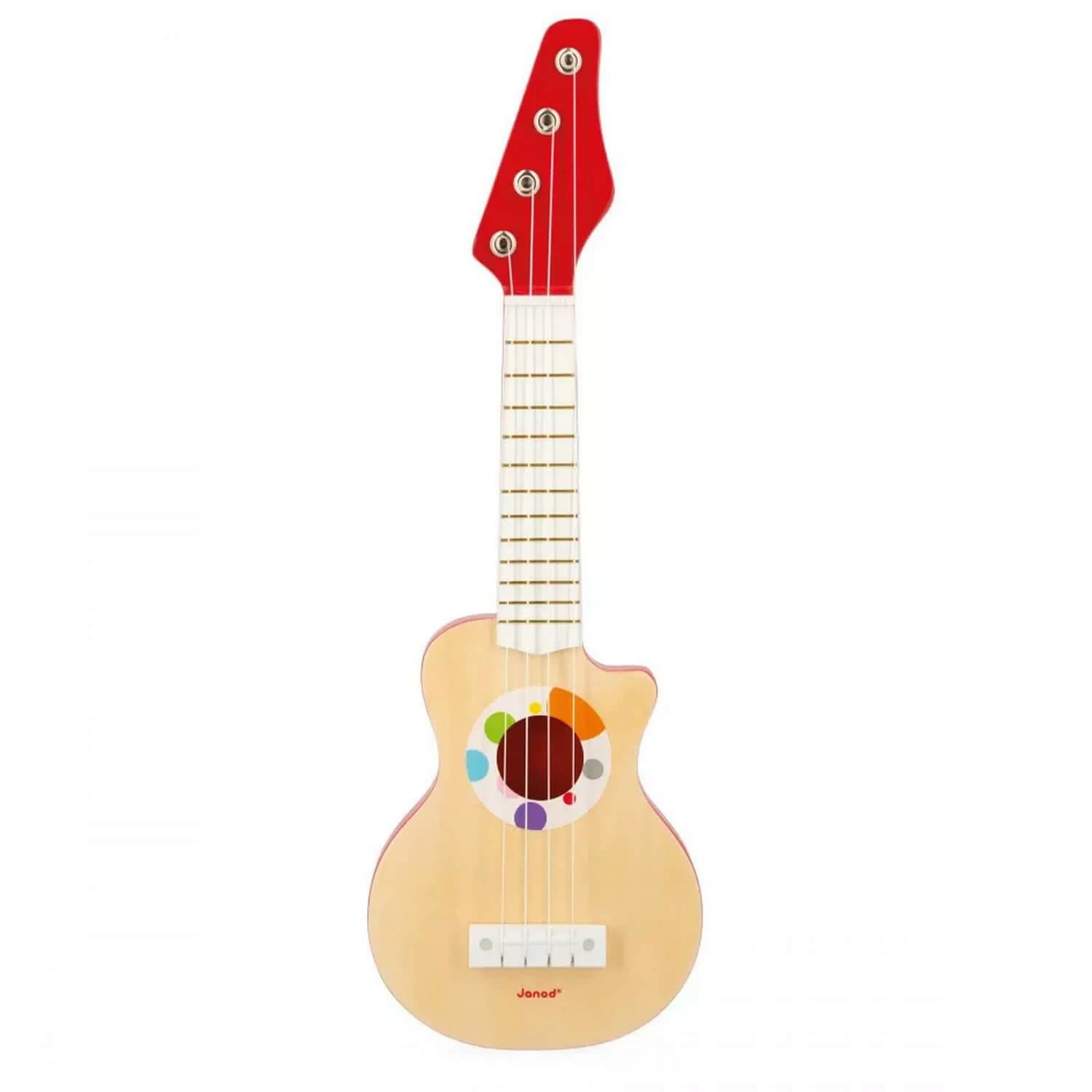 Branchez les guitares ! Si des petits rockeurs se dĂ©hanchent chez vous dĂšs que les premiers accords de guitares se font entendre, voici un cadeau idĂ©al qui leur permettra d’imiter les plus grandes rock stars en festival ! Cette magnifique guitare au style puissant va Ă©lectriser les fans de musique ! Concerts et imitation garantis avec ce jouet musical en bois aux couleurs de notre gamme Confetti. Ses tons bois clair, rĂ©haussĂ©s de pois multicolores et son manche rouge en font un instrument unique ! EquipĂ©e de 4 cordes, cette guitare jouet permettra aux enfants dĂšs 3 ans de dĂ©couvrir les sons et dâĂ©veiller leur sens du rythme. Un set de cordes supplĂ©mentaire est ajoutĂ©, de quoi satisfaire tous les musiciens, mĂȘme les plus dynamiques !