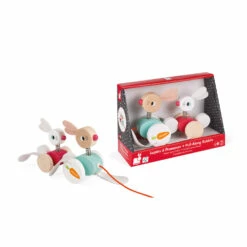 Ce magnifique jouet d’Ă©veil en bois, feutrine et piĂšces de simili cuir est formĂ© de deux jolis petits lapins aux couleurs vives sur deux roues, une maman et son petit. Votre enfant Ă partir de 12 mois pourra les tirer derriĂšre lui dans la maison et partout oĂč il va car la petite famille de lapins est munie d’une cordelette Ă l’avant.