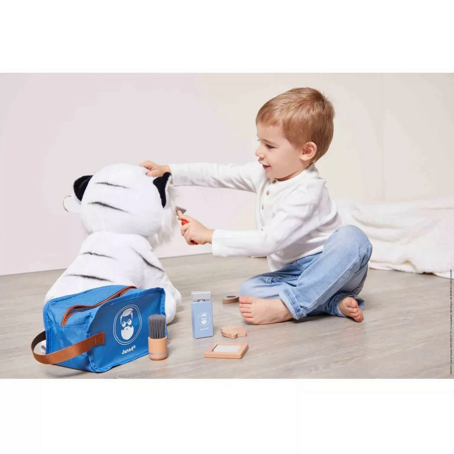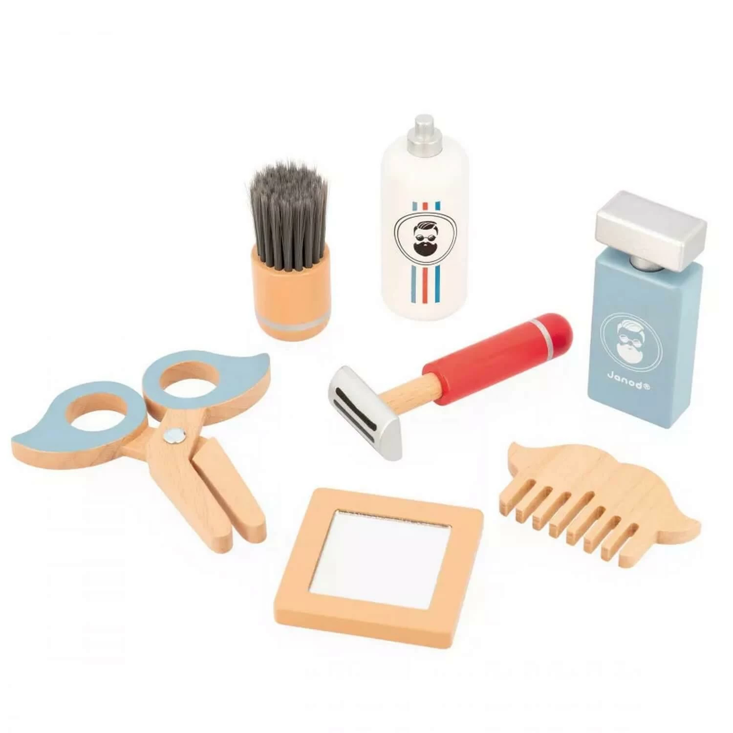 Ce set contient toute une panoplie d’accessoires stylĂ©s et imitant Ă la perfection ceux du coiffeur/barbier : un blaireau et sa mousse Ă raser pour le visage, un rasoir, un peigne pour la barbe ou les cheveux, des ciseaux trop rigolos, un miroir pour s’admirer et un parfum pour la touche finale ! VoilĂ un jouet d’imitation complet pour nos apprentis coiffeurs !