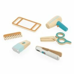 Tous ces accessoires sont en bois FSCÂź (bois issus de forĂȘt gĂ©rĂ©es durablement) et laisse apparaitre la couleur naturelle de celui-ci. On craque Ă©galement sur le design soignĂ© et les couleurs de ce kit du parfait petit coiffeur dans des tons bleus / orangĂ©s (peinture Ă l’eau) assortis Ă la trousse bleue ciel.