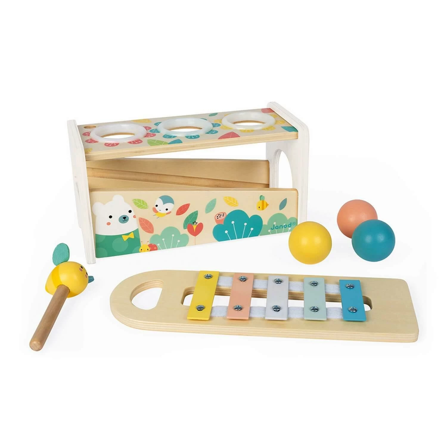Autour d’un jeu en bois, votre enfant va pouvoir s’amuser Ă jouer avec les boules et les faire rouler sur la pente ; et va Ă©galement pouvoir s’initier au xylophone.