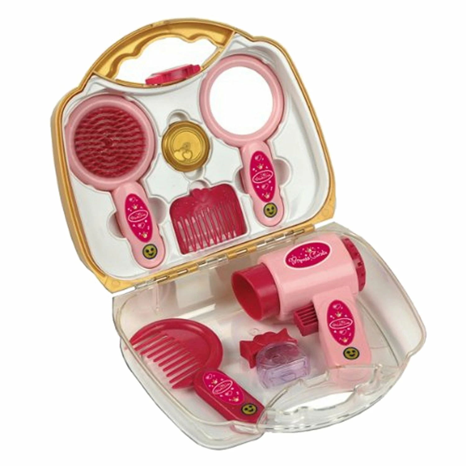 Contenu : SÚche cheveux, brosse, miroir, peigne, flacon de produit cosmétique factice.
