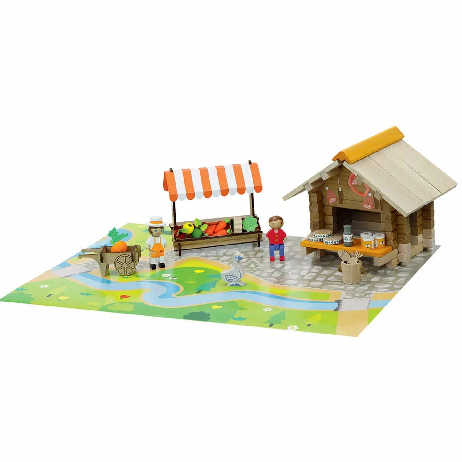 Ce jeu de construction de très bonne qualité ravira tous les enfants à partir de 5 ans qui vont pouvoir allier construction et imagination. Fabriqué en bois naturel teinté, ce kit de construction comprend 80 pièces qui assemblées les unes sur les autres forment un joli chalet et un étal pour vendre fruits et légumes.
