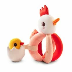 Ce hochet original et doux est facile à saisir par les petites mains de bébé grâce aux poignées qui forme le corps. Ce hochet est formé d’une poulette, Paulette, une maman très affectueuse qui couve son petit. Elle cache en effet un petit poussin qui vient de sortir de sa coquille. Avec ses jolies couleurs et sa prise en main facile et sa texture toute douce, ce hochet sera parfait pour amuser les tout-petits et les consoler lors de gros chagrins.