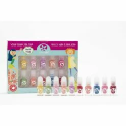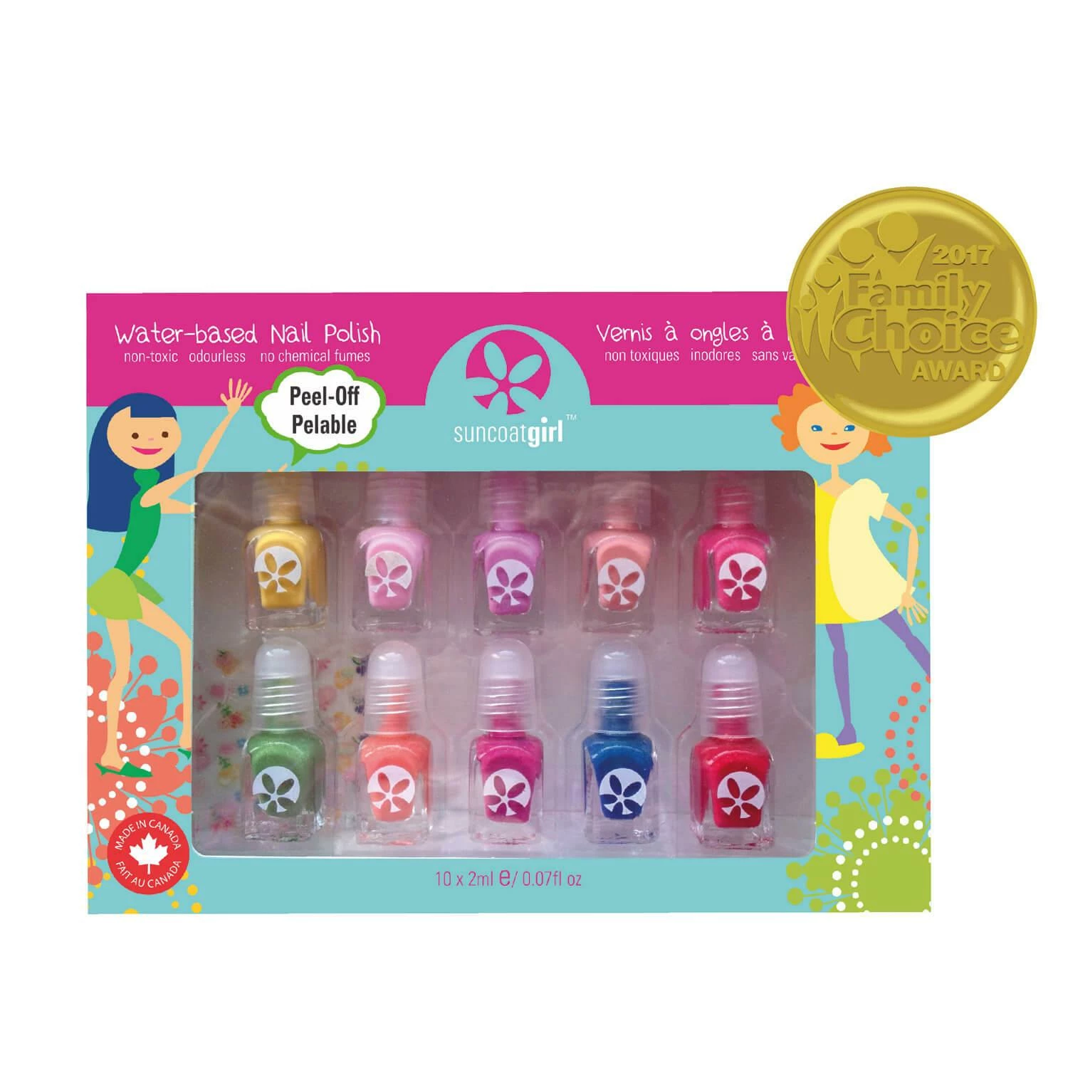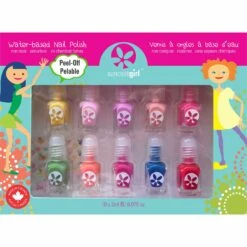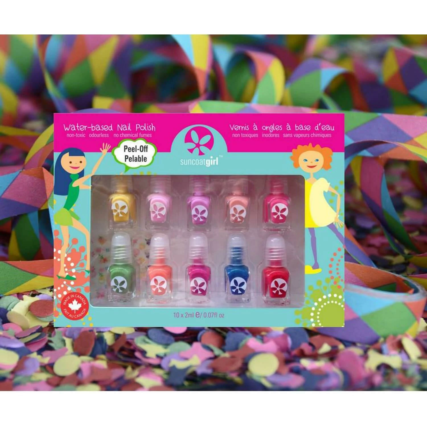Kit de la marque SuncoatGirl de 10 mini-vernis à ongles à base d’eau offrant plusieurs couleurs avec des stickers suscitant la créativité et le bonheur des enfants !
