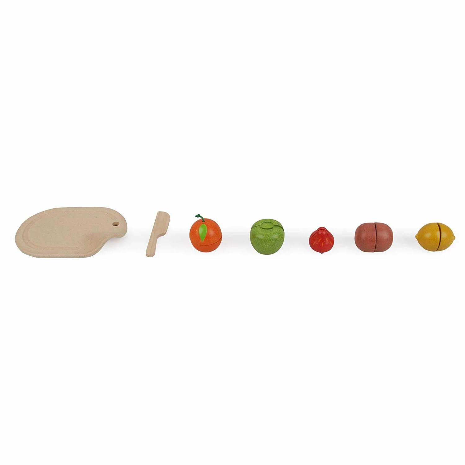 Cet assortiment PlanToys propose 5 fruits à découper trÚs réalistes avec les feuilles et les pépins en relief, mais aussi 1 planche à découper et 1 couteau pour imaginer cuisiner ces aliments. Les deux parties du fruit tiennent ensemble grùce à des velcros. Votre enfant a donc la possibilité de de le couper en deux avec le couteau qui détachera le velcro et de le reconstituer à sa guise grùce au scratch.