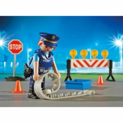 Les panneaux et la barriĂšre signalent le contrĂŽle de police. Les policiers ont des armes. La caisse pour chien peut ĂȘtre rangĂ©e dans le coffre de la Voiture de policiers avec gyrophare et sirĂšne, disponible sur notre site et sous la rĂ©fĂ©rence Playmobil-6873.