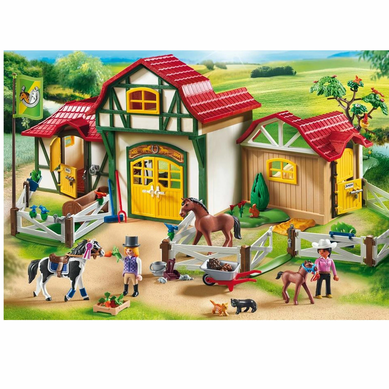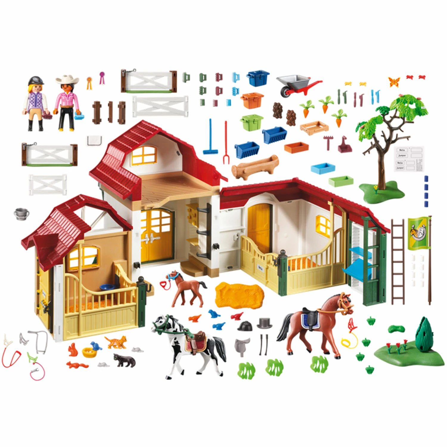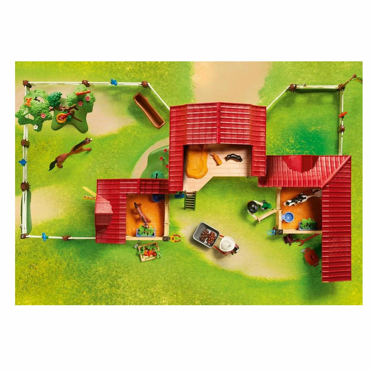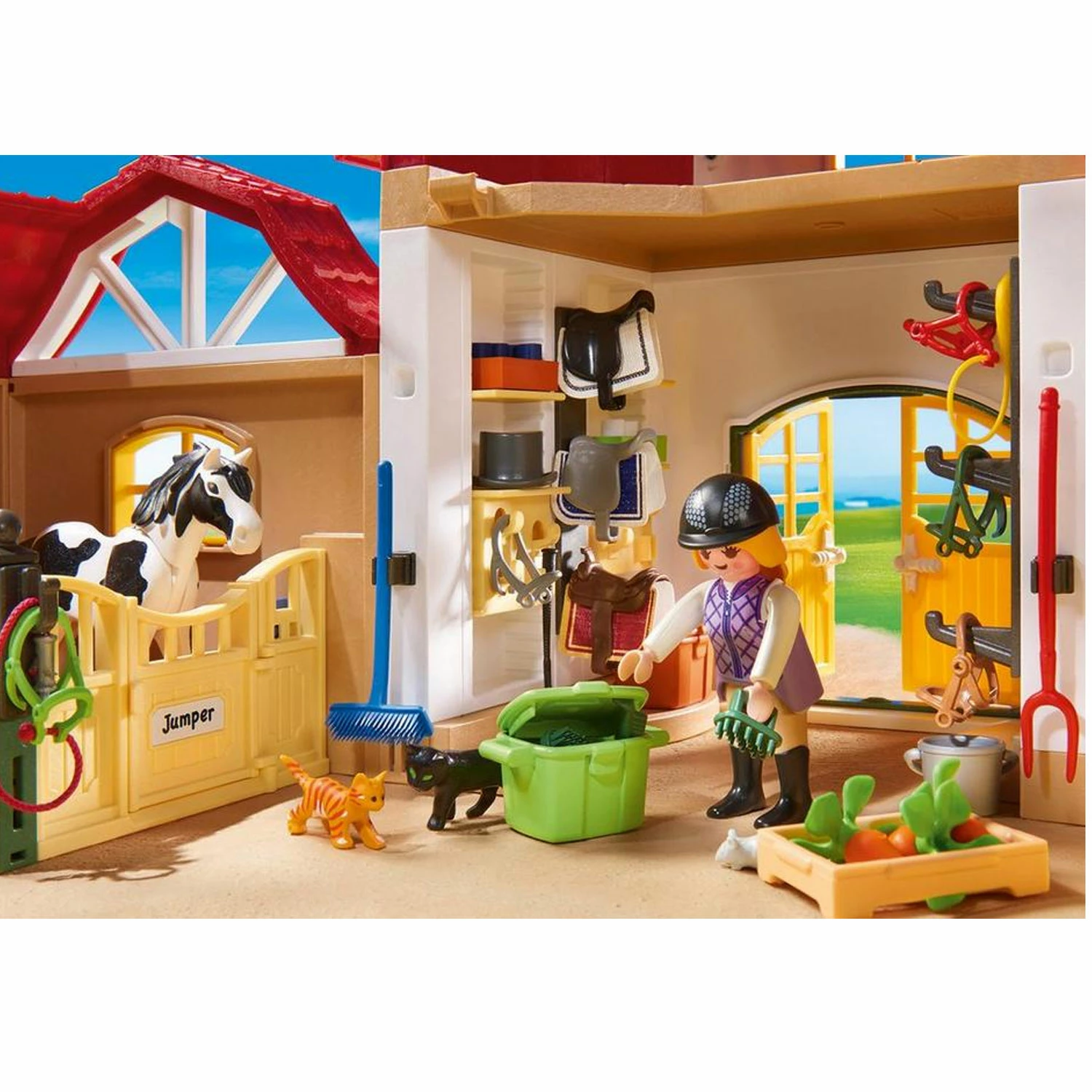 Une porte dans chacun des deux boxes verrouillables permet aux chevaux d’accĂ©der directement au vaste champ. La grande sellerie est Ă©quipĂ©e de nombreux accessoires trĂšs rĂ©alistes.