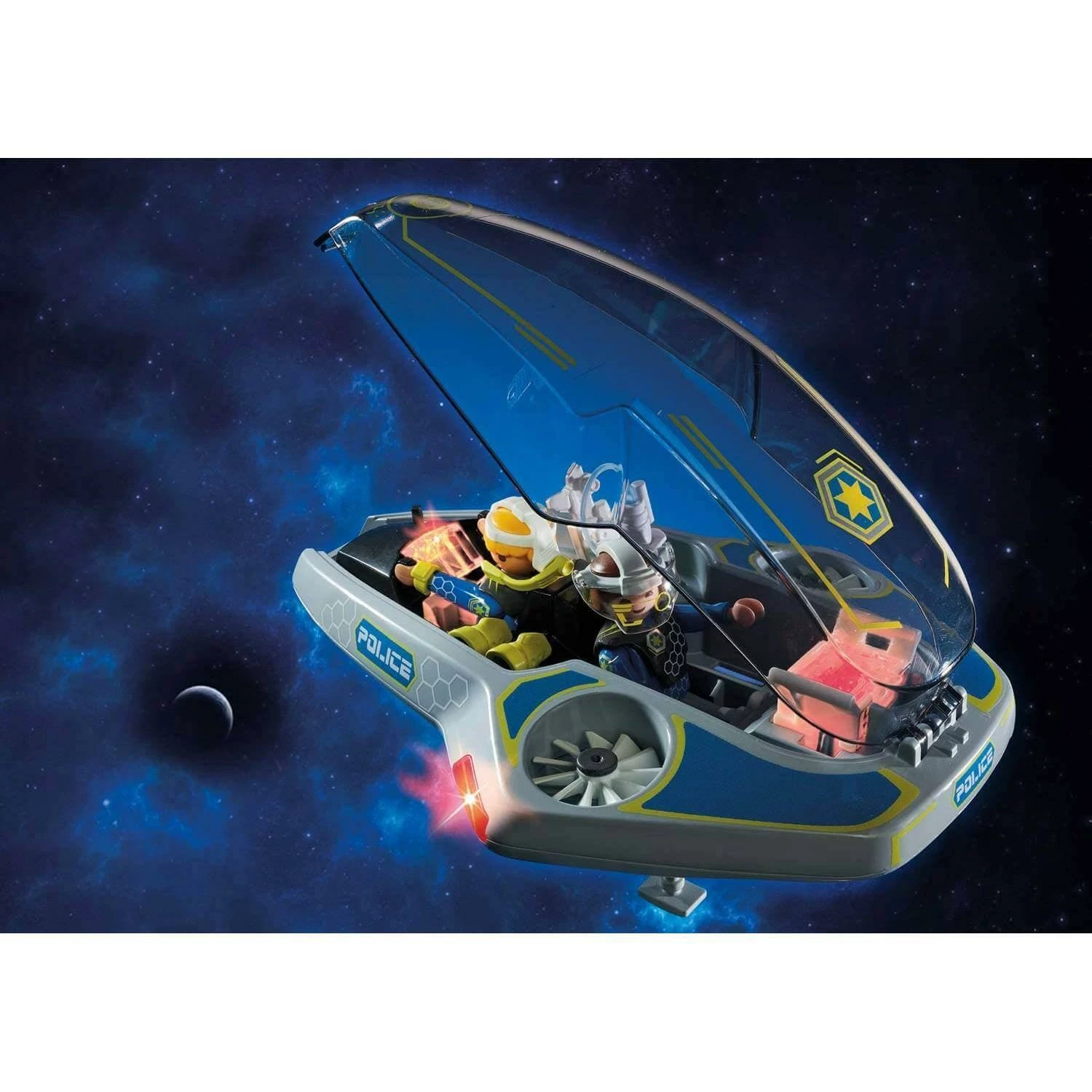 Contenu : 3 personnages PLAYMOBIL Galaxy Police-Glider avec gyrophare, module Ă©nergĂ©tique et rotors mobiles, un vaisseau spatial de pirate avec canon, chaussures d’astronaute, armes spatiales ainsi que d’autres accessoires.