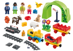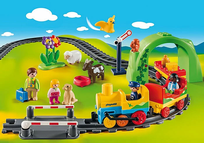 Tchou Tchou… Les tout-petits peuvent voyager en train avec la ligne de chemin de fer PLAYMOBIL 1.2.3 et dĂ©couvrir des animaux sympathiques. Les passagers peuvent prendre place dans les wagons grĂące Ă un jeu de forme et les bagages sont transportĂ©s avec le wagon de fret. Avec un tunnel, un passage Ă niveau et une signalisation ferroviaire.