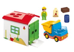 Avec son grand camion, l’ouvrier amĂšne le chargement dans l’entrepĂŽt. Il s’avance prudemment en marche arriĂšre, ouvre le container, et tout glisse dans le bĂątiment. C’Ă©tait facile. Dans ces cas-lĂ , le travail, c’est trĂšs amusant ! Le PlaySet se compose d’un entrepĂŽt, d’un camion avec container inclinable, de diffĂ©rentes cargaisons : dĂ©chets, sacs, colis, et d’autres accessoires. Super fonction : avec la fonction de tri sur le toit, les petits enfants apprennent Ă reconnaĂźtre les formes et Ă ordonner correctement les objets. Comprendre le monde en s’amusant avec PLAYMOBIL 1.2.3. Les PlaySets conviennent parfaitement aux enfants Ă partir de 18 mois. Avec leurs formes rondes et leurs couleurs vives, et dans la mesure oĂč ils ne contiennent aucune piĂšce susceptible d’ĂȘtre avalĂ©e, les PlaySets sont sĂ»rs, de qualitĂ©, et raviront aussi bien les enfants que les parents.