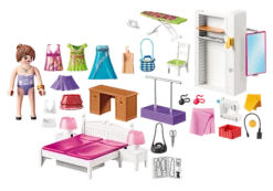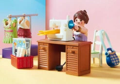 La couture a toujours fait partie des passe-temps prĂ©fĂ©rĂ©s de maman ! C’est pourquoi, dans la nouvelle maison, elle a installĂ© son propre coin couture dans la chambre. Elle y crĂ©e de magnifiques robes qu’elle fabrique elle-mĂȘme avec la machine Ă coudre. Ce sont de vĂ©ritables bijoux ! Lorsqu’elle ne porte pas ses splendides vĂȘtements, la maman les accroche avec fiertĂ© sur des portants et sur une Ă©tagĂšre. La chambre avec coin couture comprend un lit double avec couvre-lit, des lampes de chevet lumineuses, une grande armoire avec miroir, une table de couture avec machine Ă coudre, un portant de vĂȘtements avec des cintres et de trĂšs beaux vĂȘtements, une table Ă repasser avec fer Ă repasser, diffĂ©rents patrons et une figurine PLAYMOBILÂź. Les lampes de chevet peuvent ĂȘtre Ă©teintes et allumĂ©es (piles non incluses). La machine Ă coudre peut ĂȘtre allumĂ©e Ă l’aide de la manivelle latĂ©rale de maniĂšre Ă ce que l’aiguille se dĂ©place de haut en bas.