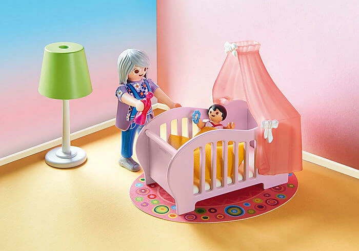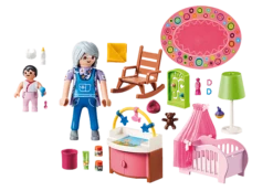 Même le petit dernier de la famille a sa propre chambre dans la grande maison de poupées. Dans la chambre de bébé, il y a tout ce qu’il faut pour un bébé heureux : un confortable lit à barreaux avec ciel de lit, une table à langer avec mobile et bien sûr des jouets. Lorsque mamie vient rendre visite au bébé, elle s’installe dans le confortable rocking chair à côté du lit pour raconter des histoires, nourrir le bébé et chanter. Le PlaySet comprend deux figurines PLAYMOBIL® (grand-mère et bébé), une table à langer avec commode, un rocking chair, un lit pour bébé, un lampadaire, des jouets et bien d’autres accessoires. La chambre de bébé s’intègre parfaitement à Ma grande maison de poupées réf. 70205. Avec ses riches détails, le nouvel univers de jeu Maison de poupées PLAYMOBIL® invite à des jeux de rôles créatifs autour de la vie de famille.
