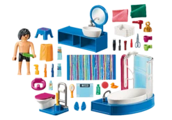 Cette salle de bains est une vĂ©ritable oasis de bien-ĂȘtre pour toute la famille ! La grande baignoire invite Ă prendre des bains, des douches et Ă barboter. Avec un tabouret, mĂȘme les enfants en bas Ăąge atteignent le lavabo et l’armoire offre suffisamment de place pour ranger les serviettes, le peigne, le rasoir et le sĂšche-cheveux. Le PlaySet comprend une figurine d’homme PLAYMOBILÂź, une baignoire avec douche intĂ©grĂ©e, un lavabo avec paniers, des toilettes avec support spĂ©cial pour les enfants, une balance et bien d’autres accessoires de toilette. La salle de bains s’intĂšgre parfaitement Ă la grande maison de poupĂ©es rĂ©f. 70205. Avec ses riches dĂ©tails, le nouvel univers de jeu Maison de poupĂ©es PLAYMOBILÂź invite Ă des jeux de rĂŽles crĂ©atifs autour de la vie de famille.