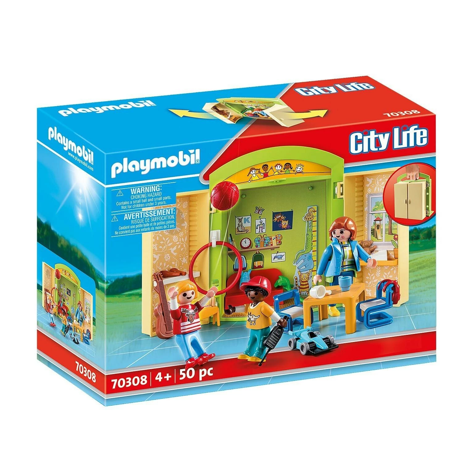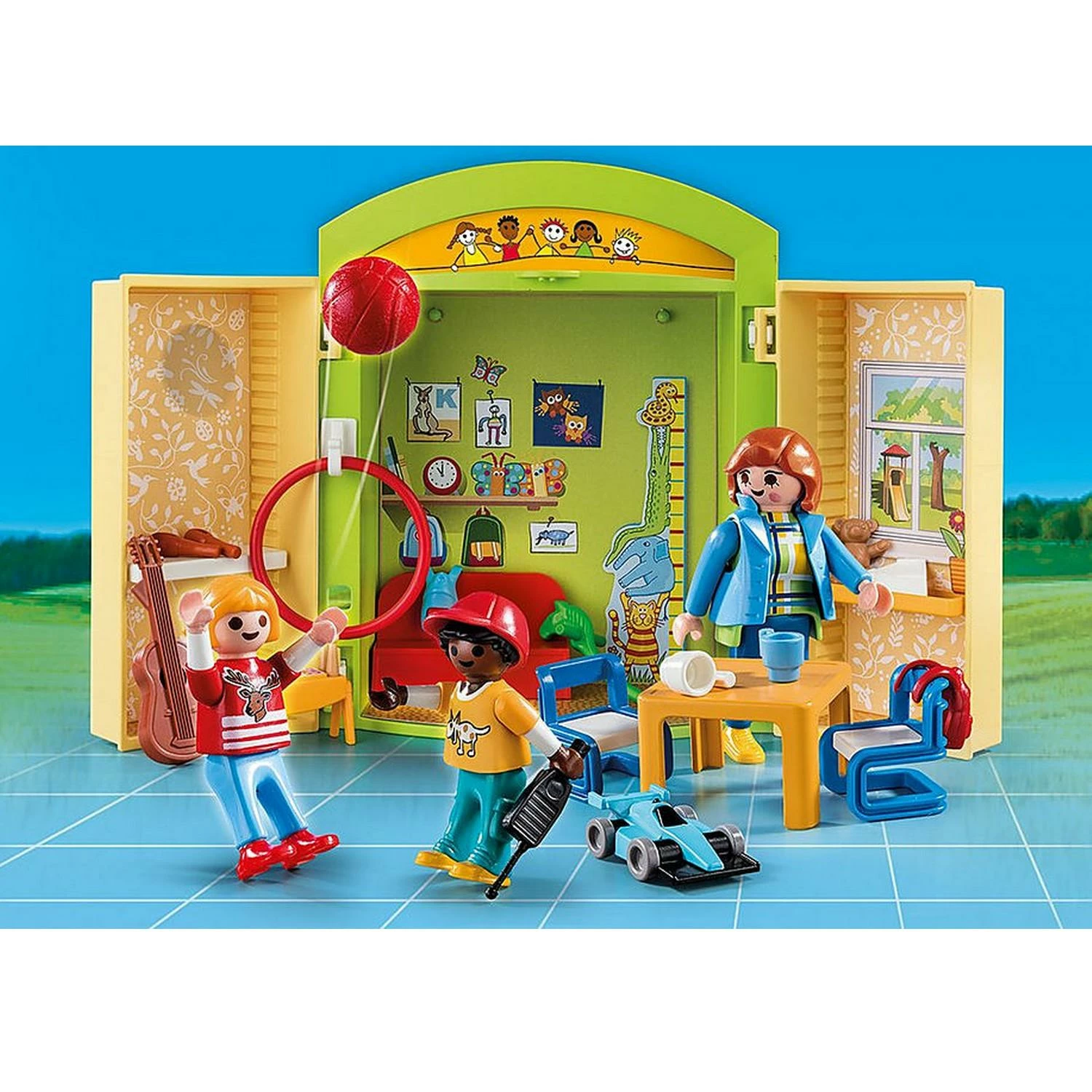 Le coffre Garderie contient une maßtresse de maternelle, deux enfants, des jouets et du matériel pour les activités.