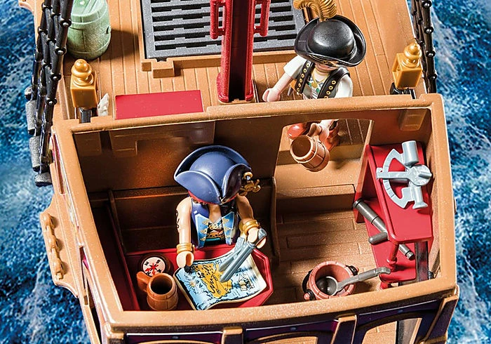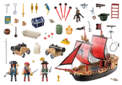Le PlaySet comprend un bateau de pirates, trois personnages Playmobil, un atèle, un perroquet et deux rats. Le bateau flotte sur l’eau et peut ĂŞtre Ă©quipĂ© d’un moteur submersible radiocommandĂ© (ref 9853).