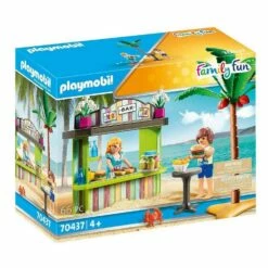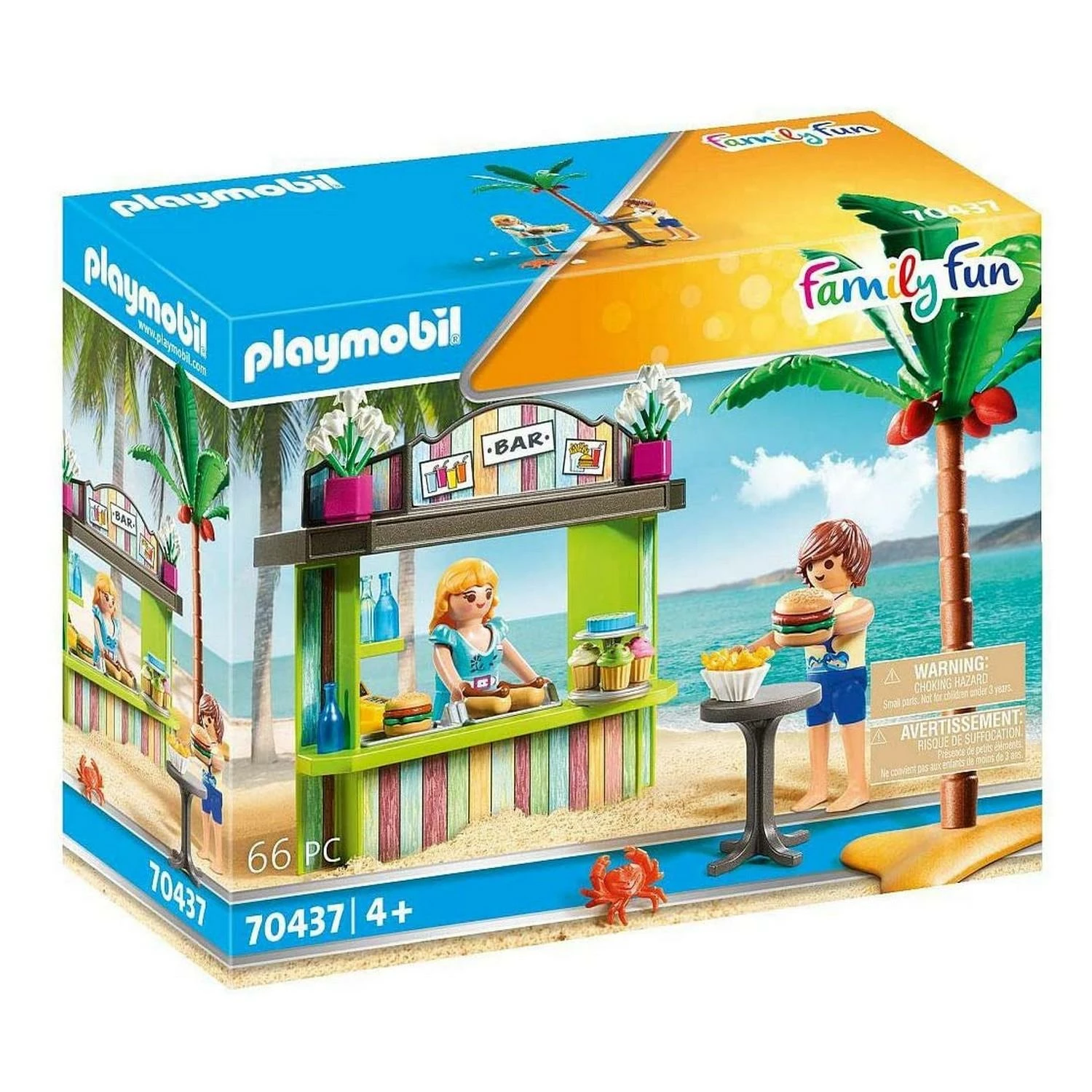 Contient 2 personnages, 1 table haute, 1 crabe, des aliments (frites, hamburgers, cupcakes, hot-dogs,âŠ), 1 caisse enregistreuse et d’autres accessoires (palmier, bouteilles, fleurs,âŠ)
