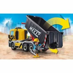 Contenu : 1 personnage d’ouvrier avec son casque et ses gants, un camion avec structure Ă©volutive, une benne, une plateforme, une boĂźte Ă outils avec couvercle, un bidon d’essence et d’autres accessoires de construction.