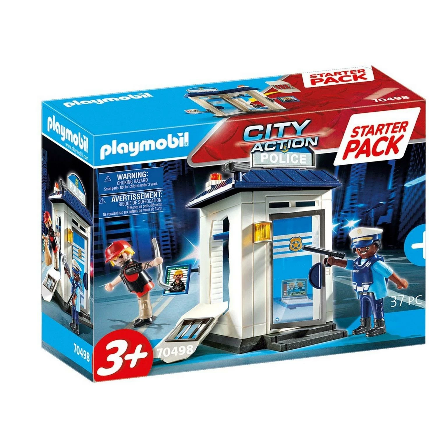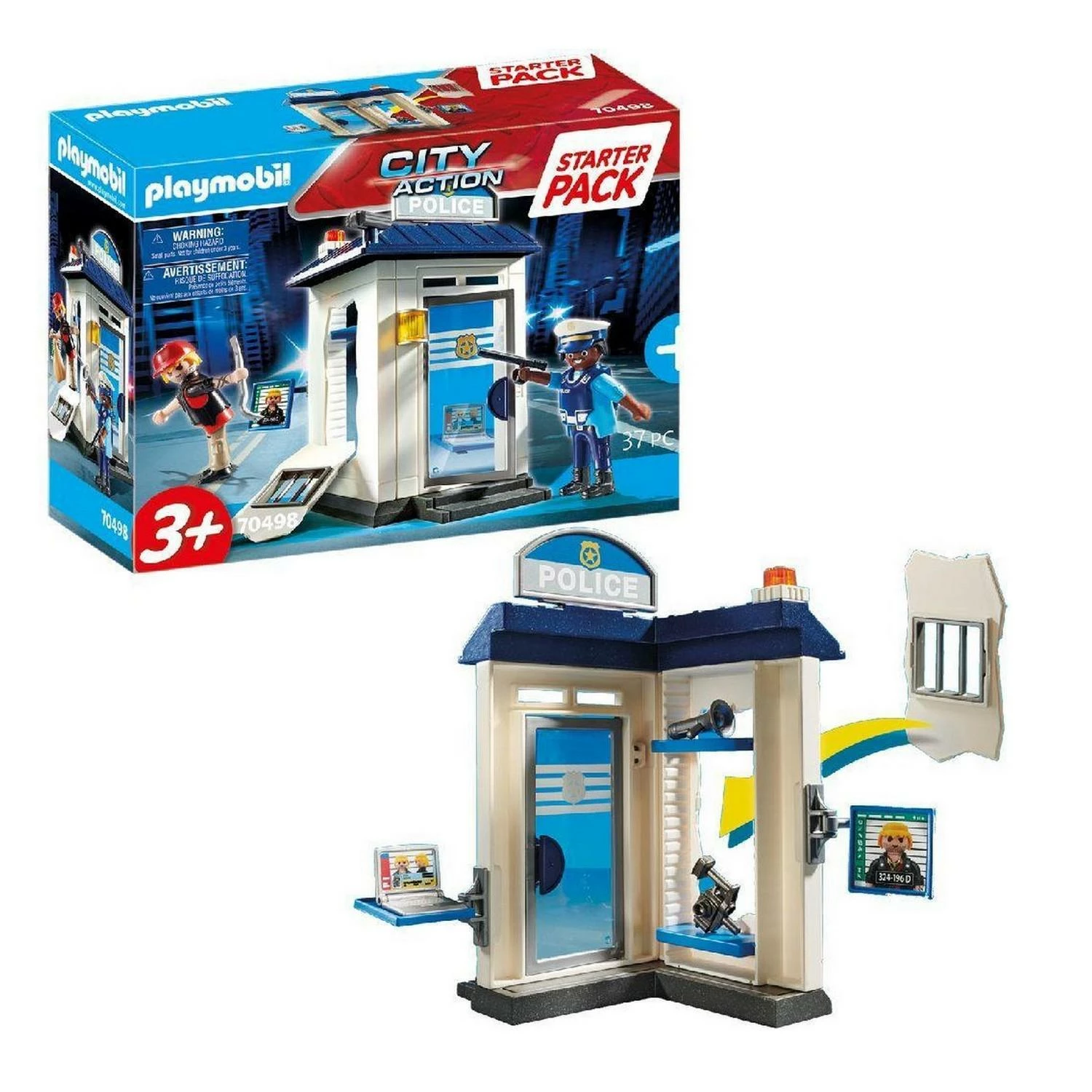 Ce coffret contient deux personnages, le commissariat de police et des accessoires (ordinateur portable, matraque, appareil photo, etc.). Dimensions du bâtiment : 10,5 x 12 x 18,5 cm (LxPxH)