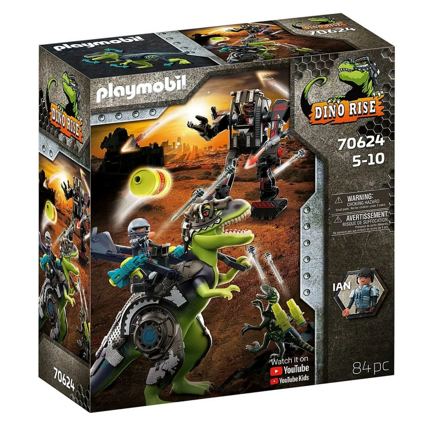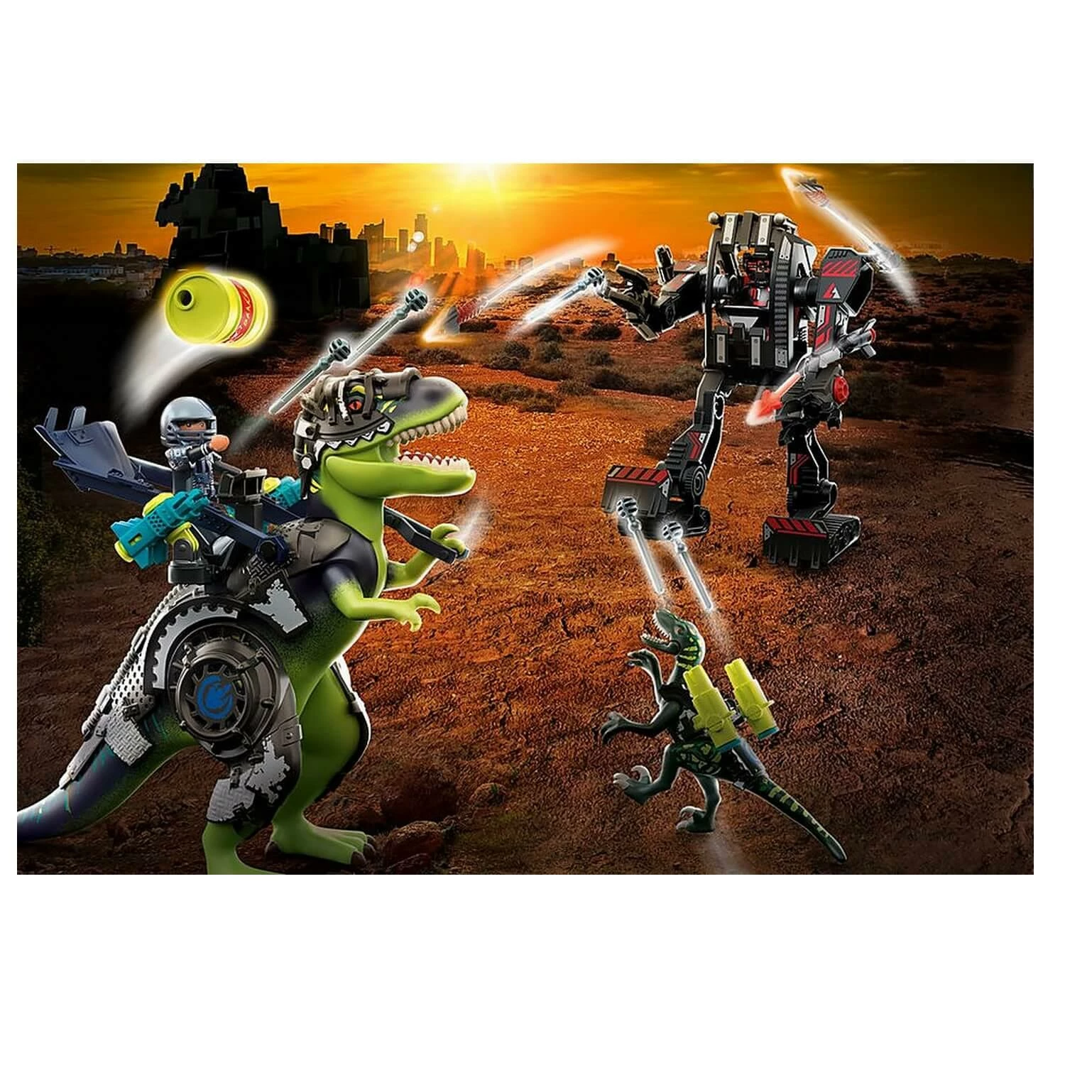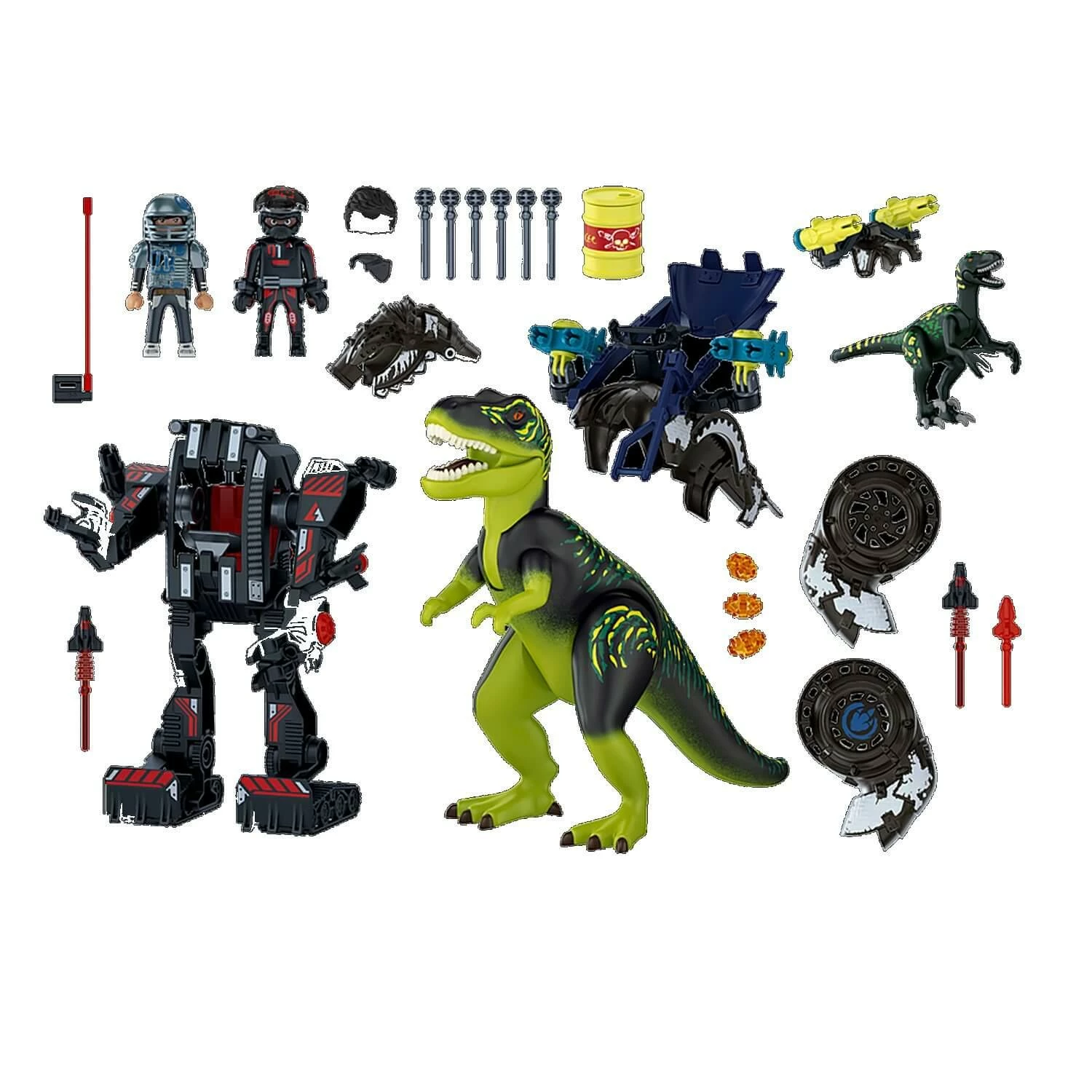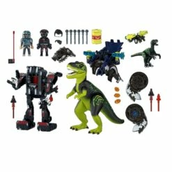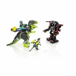 Contient 84 piÚces : 2 personnages Playmobil, 1 T-rex, 1 Vélociraptor, 1 robot géant et de nombreux accessoires (projectiles, baril, etc.).