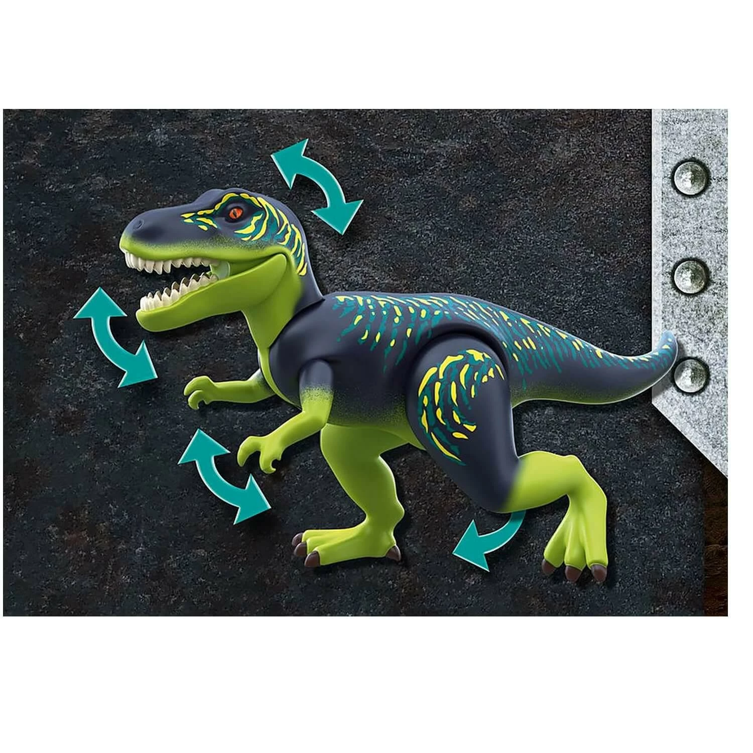 Les armures des dinosaures sont amovibles. Un personnage Playmobil peut s’installer sur le dos du Tyrannosaure pour le diriger et un autre dans le cockpit du robot Playmobil.